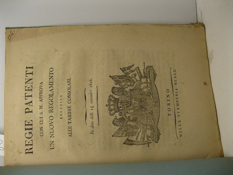 In 4, pp. 31 + (1b). Carta uniformemente brunita. Stemma xil. al fr. Br. muta. Regolamento promanato da Vittorio Emanuele I con le tariffe consolari divise per l'estero in 5 gruppi: consolati nell'Ocenao, nel Mare del Nord, Mar Nero, Baltico, Indie orientali, Africa; consolati di Spagna, Mediterraneo, Baleari, Malta, Gibilterra, Austria; consolati di Napoli, Bari, Palermo, Messina, Ancona; di Tolone, Corsica, isola d'Elba, Piombino, Roma e Civitavecchia; e infine consolati di Marsiglia e di Livorno. Manno, Promis, Zucchi, p. 105.