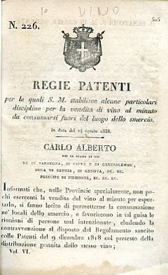 Regie Patenti per le quali S. M. stabilisce alcune particolari discipline per la vendita di vino al minuto da consumarsi fuori del luogo dello smercio. In data del 14 agosto 1838