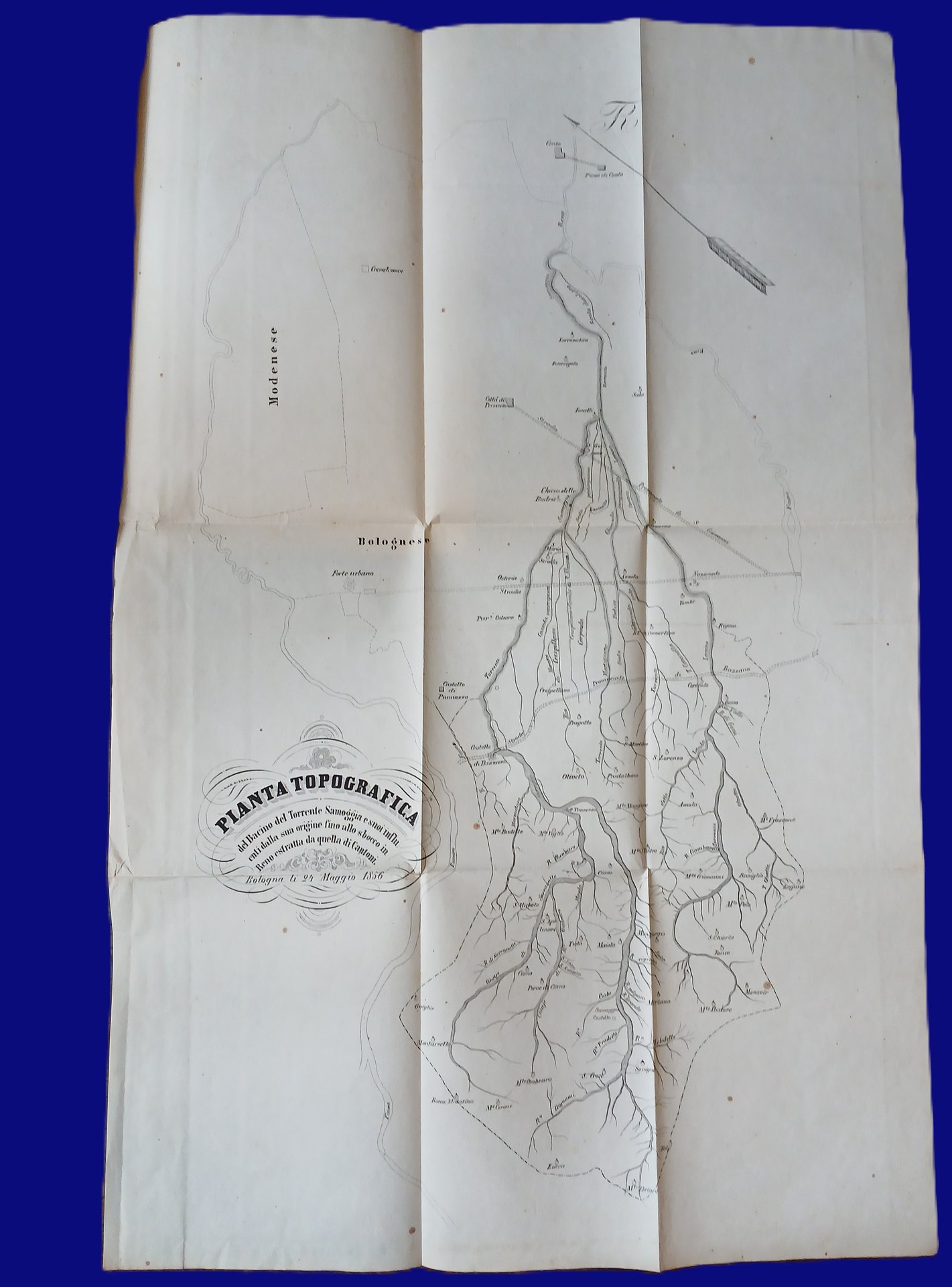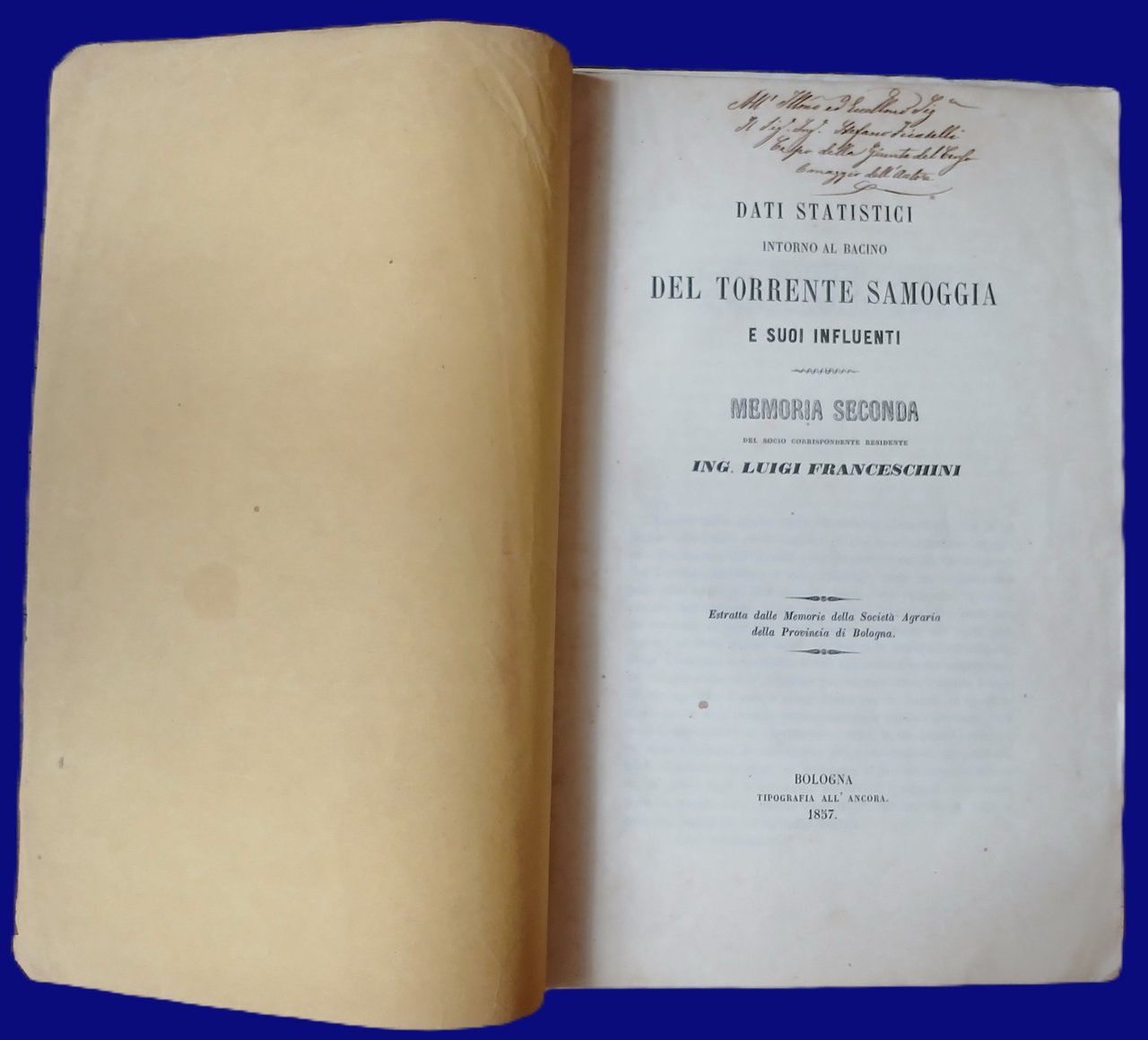 (Idrologia - Emilia Romagna - Valsamoggia - Corsi d'acqua della provincia bolognese e modenese) Due opuscoli in 8°, brossura originale in carta gialla. "Regime idraulico del Torrente Samoggia e suoi influenti e dell'agricoltura antica e moderna del suo bacino", 1856, pp. 32, con tabelle nel testo. Memoria letta alla Società Agraria di Bologna nella Seduta del 28 maggio 1855. Dedica autografa dell'autore al piatto anteriore della brossura. "Dati statistici intorno al bacino del Torrente Samoggia e suoi influenti. Memoria seconda estratta dalle Memorie della Società Agraria della Provincia di Bologna", 1857, pp. 19,(1), con 6 tavole ripiegate fuori testo tra cui la "Pianta Topografica del Bacino del Torrente Samoggia e suoi influenti dalla sua origine fino allo sbocco in Reno, estratta da quella di Cantoni" (cm 56 x 36,5). Dedica autografa dell'autore al margine bianco superiore del frontespizio. Alcune pieghette agli angoli esterni di alcune pagine, peraltro ottimo stato di conservazione.
