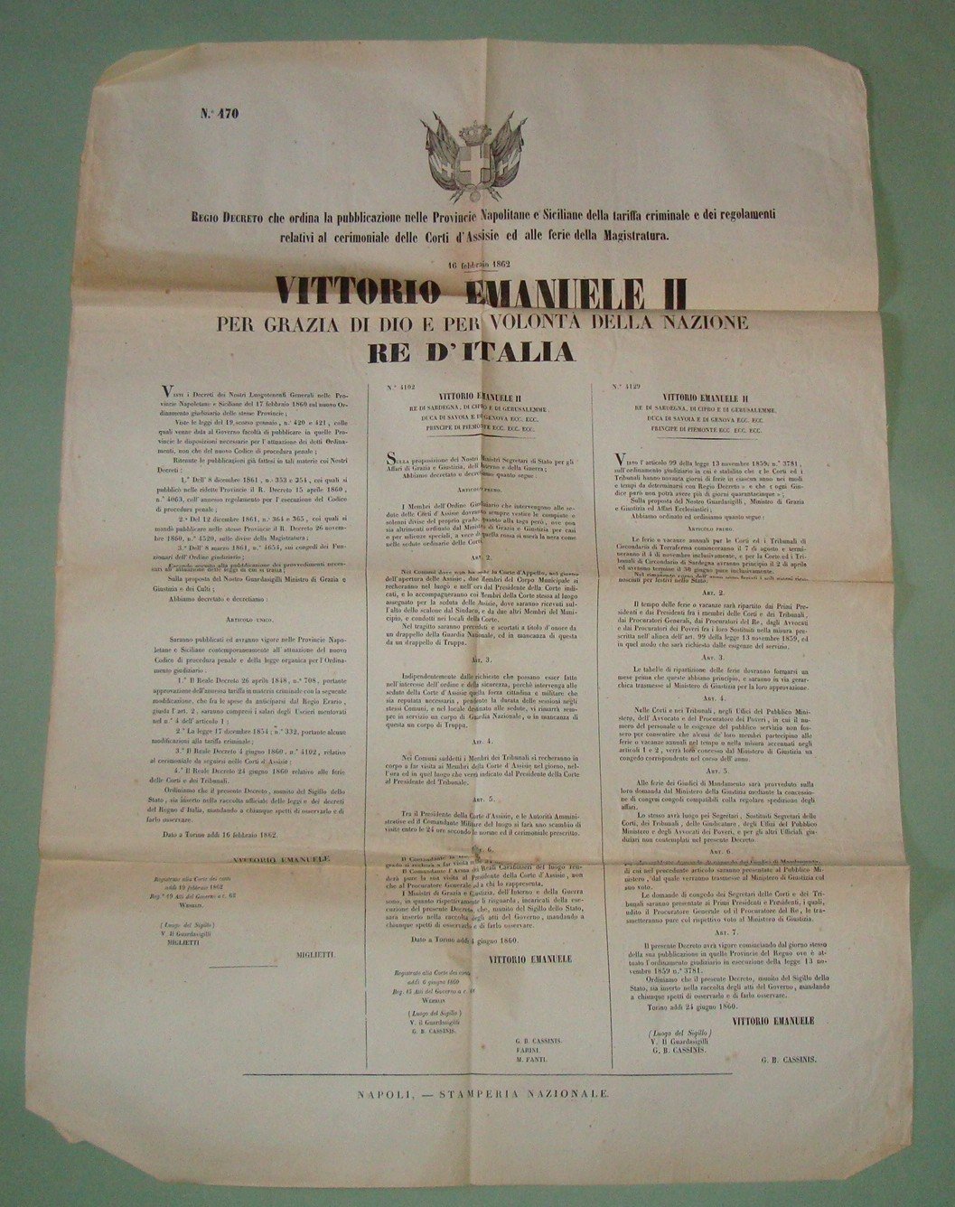 Regio Decreto 16 Febbraio 1862. Vittorio Emanuele II per grazia di Dio e per volontà della Nazione Re d'Italia. Pubblicazione nelle provincie napoletane e siciliane della tariffa criminale e dei regolamenti relativi al cerimoniale delle Corti d'Assise ed alle ferie della magistratura. Stemma reale. Napoli, Stamperia Nazionale. Cm.75x53. Numerato 470.
