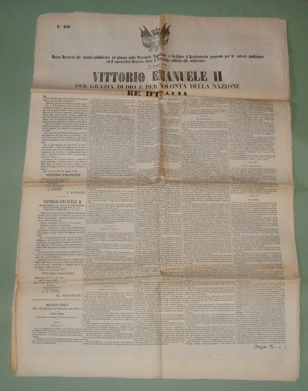Regio Decreto 25 Maggio 1862 che manda pubblicare ed attuare nelle provincie napolitane e siciliane il Regolamento generale per le carceri giudiziarie ed il successivo decreto riguardante il personale addetto alle medesime. Vittorio Emanuele II per grazia di Dio e per volontà della Nazione Re d’Italia. Stemma reale. Napoli, Stamperia Nazionale. 4 pagine, cm.75x53. Numerato 641.