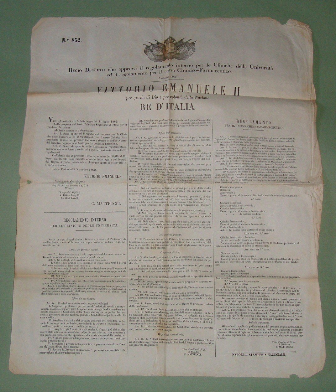 Regio Decreto 5 Ottobre 1862. Approvazione del regolamento interno per le cliniche dell'Università e regolamento per il corso chimico farmaceutico. Vittorio Emanuele II per grazia di Dio e per volontà della Nazione Re d'Italia. Stemma reale. Napoli, Stamperia Nazionale. Cm.55x43. Numerato 852.