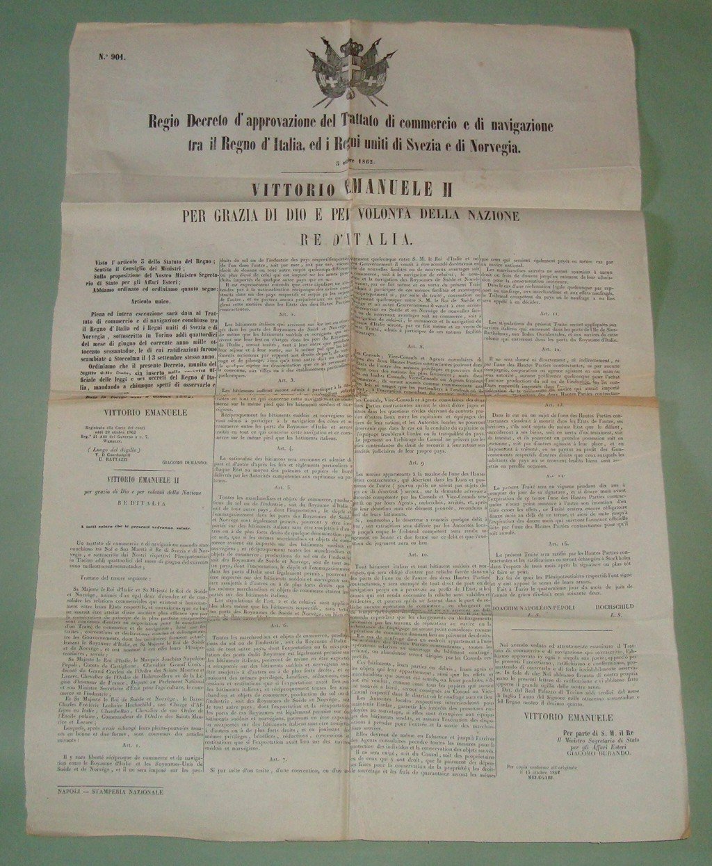 Regio Decreto 5 Ottobre 1862. Approvazione del trattato di commercio e navigazione tra il Regno d'Italia e i Regni Uniti di Svezia e Norvegia. Vittorio Emanuele II per grazia di Dio e per volontà della Nazione Re d’Italia. Stemma reale. Napoli, Stamperia Nazionale. Cm.73x53. Numerato 901.