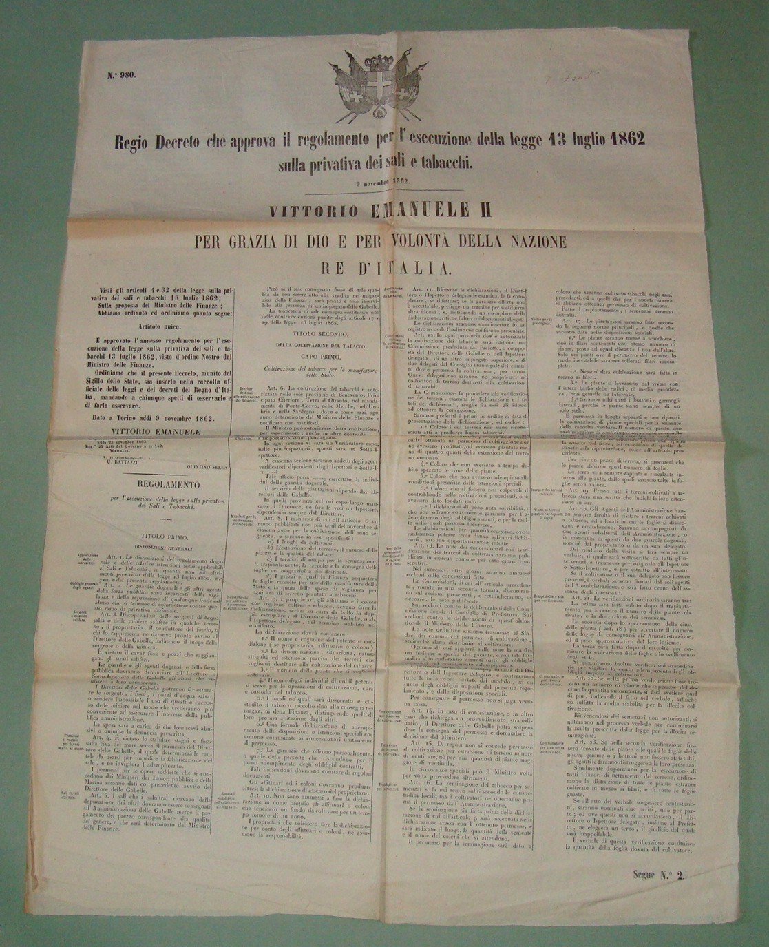 Regio Decreto 9 Novembre 1862. Vittorio Emanuele II per grazia di Dio e per volontà della Nazione Re d'Italia. Regolamento per l'esecuzione della Legge 13 Luglio 1862 sulla privativa di sali e tabacchi. Napoli, Stamperia Nazionale. Stemma reale. Due fogli cm.75x53, il terzo a tre quarti di pagina. Numerato 980.