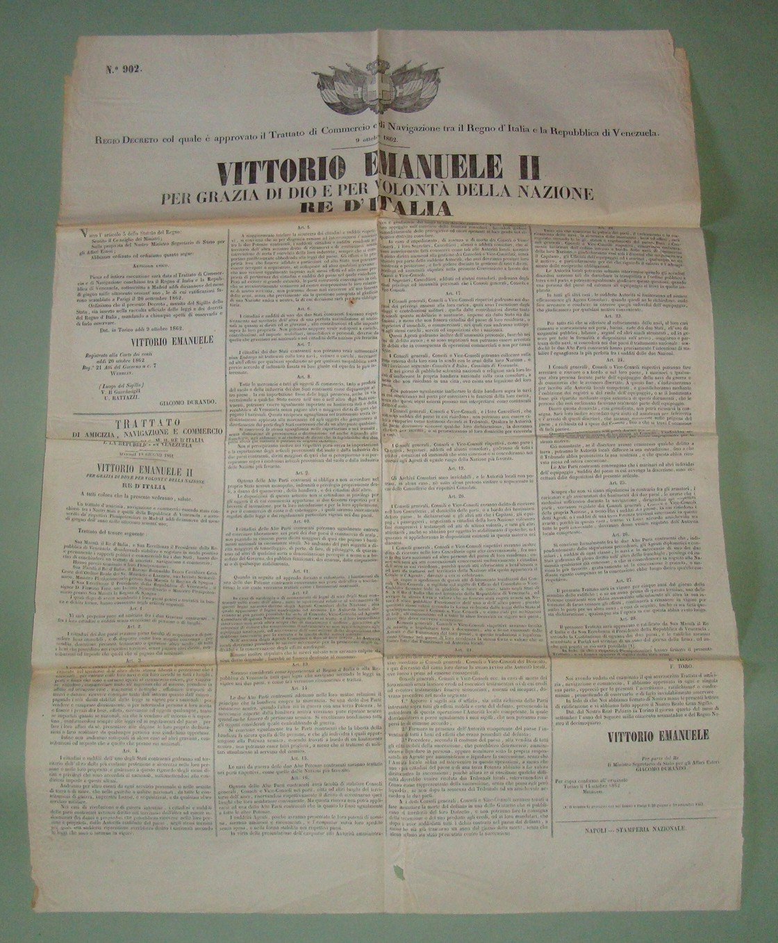 Regio Decreto 9 Ottobre 1862. Vittorio Emanuele II per grazia di Dio e per volontà della Nazione Re d’Italia. Tratttato di commercio e di navigazione tra il Regno d'Italia e la Repubblica di Venezuela. Stemma reale. Napoli, Stamperia Nazionale. Cm.75x52. Numerato 902.