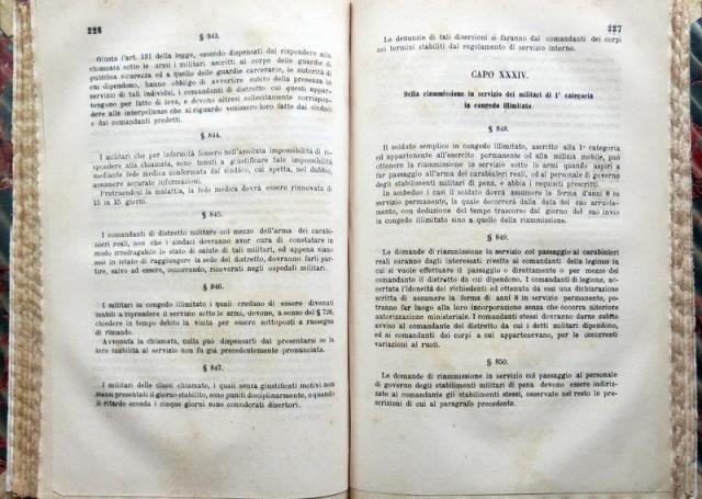 Stamperia Reale, Torino, 30 dicembre 1877. In 8vo, pp. 464 con Errata Corrige, leg. con piatti in cartonato marmorizz. in azzurro e rosa, dorso in pergamena con titolo ms. al dorso. Si tratta del Regio Decreto che approva il Regolamento delle leggi sul reclutamento dell'esercito, quindi un documento di notevole interesse e attualità. Contiene anche i codici che regolamentano l'esclusione per malattie e difformità di salute. Esemplare uniformemente ingiallito, specie alle prime carte, ma in parte intornso e molto ben conservato.