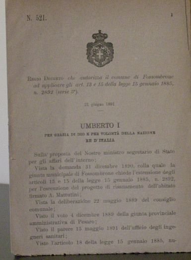 Regio Decreto che autorizza il comune di Fossombrone ad applicare gli art. 13 e 15 della legge 15 gennaio 1885, n. 2892 (serie 3?). 21 giugno 1891.