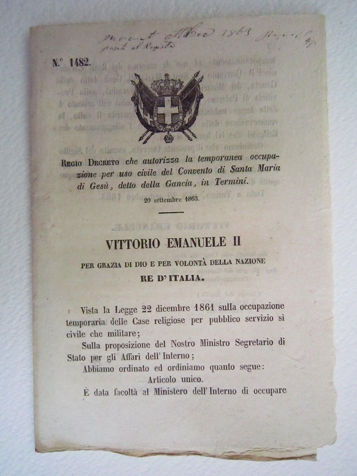 Regio Decreto Diritto Temporaria Occupazione Convento Ges˘ 1863 Bollettino Leggi