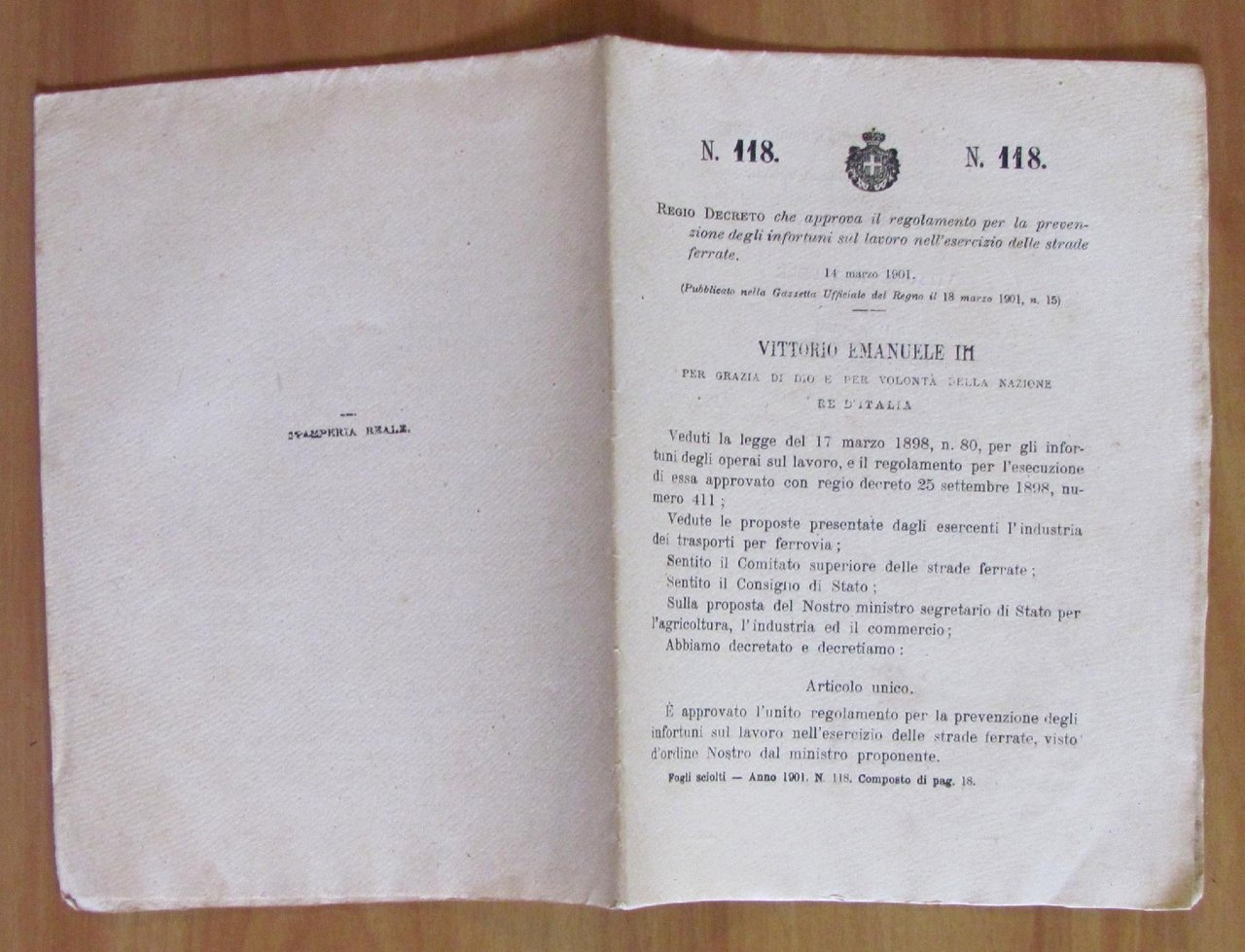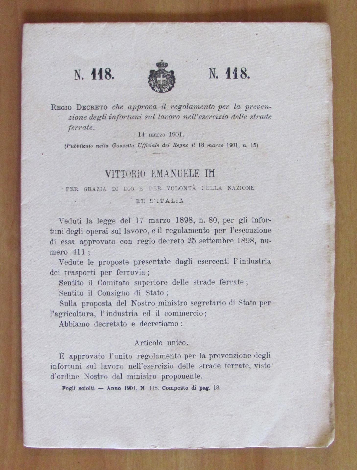Regio Decreto che approva il regolamento per la prevenzione degli infortuni sul lavoro nell'esercizio delle strade ferrate. 14 Marzo 1901 - Pubblicato nella Gazzetta Ufficiale del regno il 18 Marzo 1901. Documento originale composto di 18 pagine in quartine ripiegate. 16x22,5. Raro e in Ottimo stato. , Ottimo (Fine)