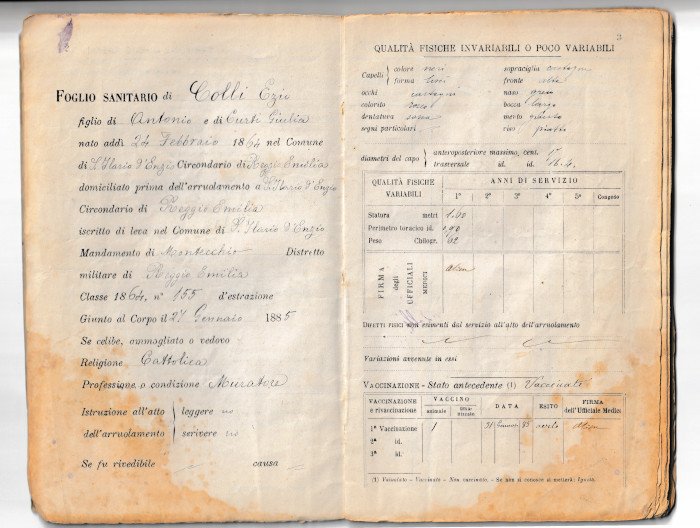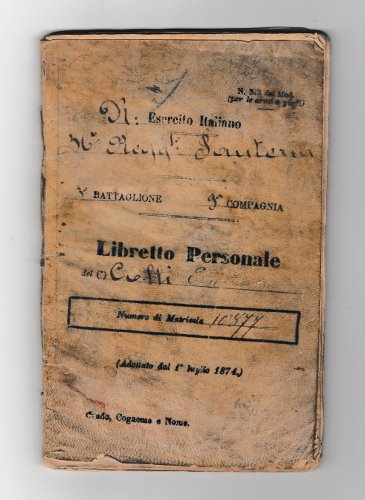 Copertina in pergamena (cm 20x12,5) pag. 74 qualche ingiallimento e altre tracce del tempo, comunque completo. -- 36° Reggimento Fanteria 3° Battaglione 9^ Compagnia. Libretto del soldato Colli Ezio di S. Ilario d'Enza nato il 24 Febbraio 1864.