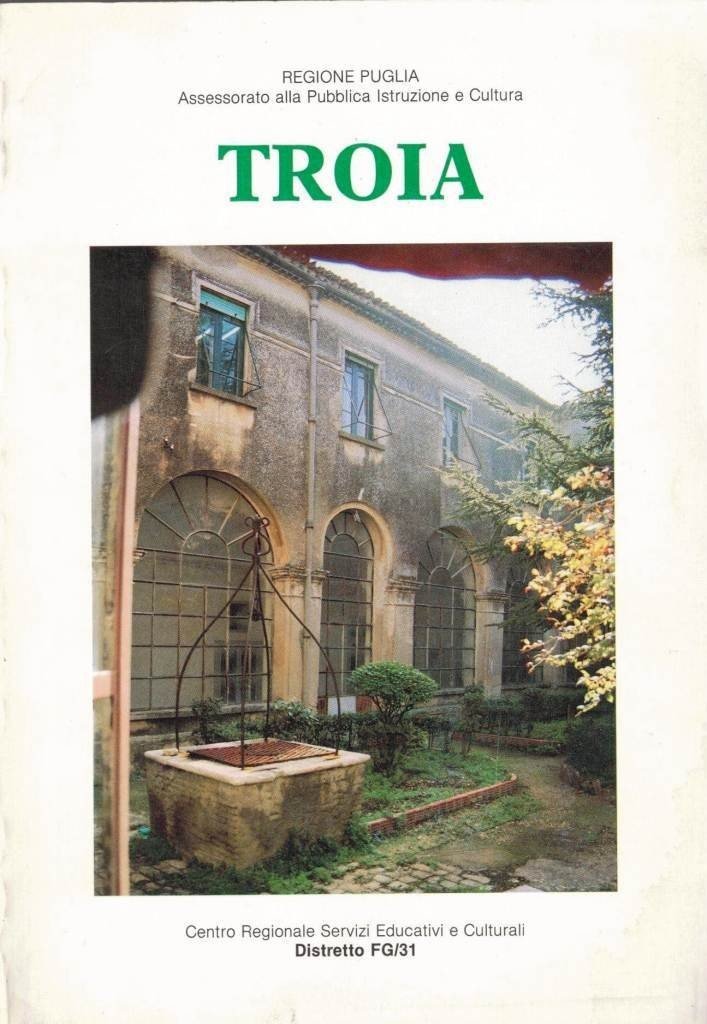 Regione Puglia – Assessorato alla P. I. e Cultura – Centro Distrettuale FG/31, Troia. Guida culturale, s.n. (ma Regione Puglia), s.l. 1989, pp. 140, ill. b.n., cm 24, br. ed. Collana Obiettivo cultura, vol. 4. Coordinamento ricerche e testi di Gennaro Ciavarella. Indice: Domenico Ercolino, Prefazione – Gennaro Ciavarella, Introduzione – Parte prima. Il territorio e le tradizioni (Prologo – La posizione – Aspetto fisico – Clima – Ecologia – Popolazione) – Parte seconda. La storia (Primo incontro – Calamità – I beni culturali: le schede – Ritrovamenti) – Appendice (Cronologia – Bibliografia) – Documenti fotografici. Tracce di gora estesa ma non particolarmente deturpante a copertina posteriore e ultime carte di testo e minima al margine di copertina anteriore e prime carte, per il resto volume in buono stato, con interno pulito e di piena fruibilità.