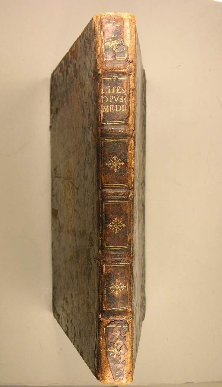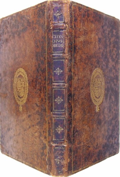 Sebastianum Cramoisy, Paris, 1639. In/4, reliure d’époque en veau mouchetée, armes sur les plats encadré d’un double filet doré, tranches mouchetées. Page de titre à vignette, lettrines et bandeaux historiés, culs-de-lampe. [16] -304., grandes marges. Reliure oxydée noircie sur les bords. Restauration ancienne des mors ; mouillures dans les marges, plus importantes en fin de volume. Armoiries de la reliure aux armes d’Anne Jacques de Bullion (1679-1745). Marquis de Fervacques, Seigneur de Longchêne, de Montlouet, de Bonnelles et d'Esclimont, et Chevalier du Saint-Esprit. Parafe de A. Charreyre. Seul recueil des oeuvres complètes de François Citois : première édition du traité sur les saignées et les purges, puis traité sur l’abstinence, enfin, la première description fidèle de la colique du Poitou. Le dernier traité, en français, concerne les remèdes contre la peste, dont celui-ci : « Un chapon noury de chair de vipère est excellent en ce temps. Les Italiens en usent pour prolonger leurs jours. » François Citois (1572-1652), né à Poitiers, fut le médecin personnel de Richelieu et de Louis XIII. Biblio : Histoire médicale générale et particulière des maladies épidémiques, 1835, p.191. Morton, 2092.4to in contemporary full spotted calf, arms on boards (Anne Jacques de Bullion) framed by double gilt fillets, engraved vignette on title page, historical letters, head & tail-pieces, large margins, [16], 304 p. Flaws : binding oxidized ; old restoration of the joints ; margin waterstaining larger at the end of the vol. This book is the only one compilation ot he complete works of Citois : first edition of the treaty upon beedings & purges, a treaty upon abstinence and the first exact description of colica pictonum ! The last part deals with the plague’s remedies. The author (1572-1652) was the Richelieu & Louis XIII ‘s personnal physician.