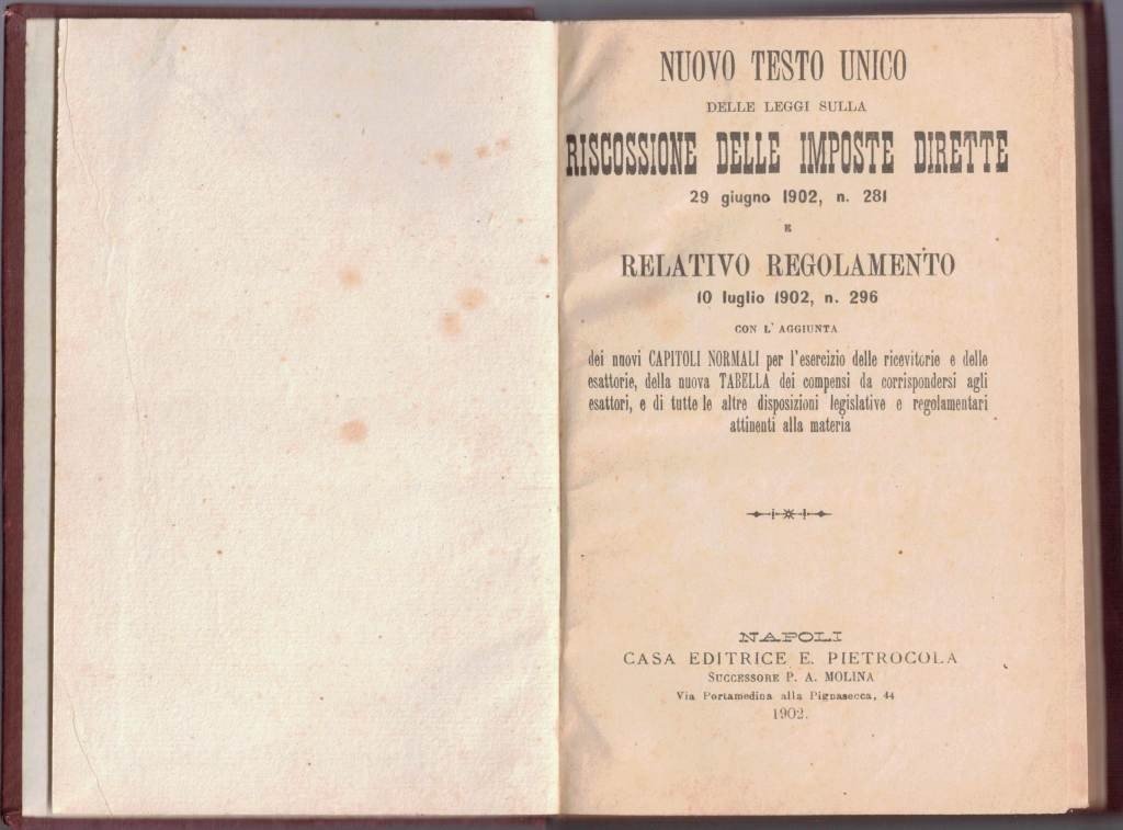 Volume miscellaneo contenente 6 regi decreti anni 1902-1907, Casa Editrice E. Pietrocola Successore P. A. Molina, Napoli 1902-1907, paginazione varia per un totale di pp. 269, cm 17, bella legatura coeva in tutta tela con titoli in oro al dorso e tagli spruzzati. Dettaglio contenuto volume: Nuovo testo unico della legge sulla riscossione delle imposte dirette 29 giugno 1902, n. 281 e relativo regolamento 10 luglio 1902, n. 296 con l’aggiunta dei nuovi Capitoli normali per l’esercizio delle ricevitorie e delle esattorie, della nuova Tabella dei compensi da corrispondersi agli esattori, e di tutte le altre disposizioni legislative e regolamentari attinenti alla materia, Casa Editrice E. Pietrocola Successore P. A. Molina, Napoli 1902, pp. 108, cm 17, legatura coeva in tutta tela con titoli in oro al dorso e tagli spruzzati. Legato con: Testo Unico della Legge sul Personale di Pubblica Sicurezza. Approvato con Regio Decreto 21 agosto 1901, n. 409. Corredato di tutte le altre disposizioni legislative e regolamentari dal medesimo richiamate, Casa Editrice E. Pietrocola Successore P. A. Molina, Napoli 1903, pp. 19. Legato con: Legge contenente disposizioni relative alla insequestrabilità degli stipendi e pensioni ed alla cedibilità degli stipendi 7 luglio 1902, n. 276. Corredata di tutte le altre disposizioni legislative e regolamentari dalla medesima richiamate, Casa Editrice E. Pietrocola Successore P. A. Molina, Napoli 1903, pp. 9. Legato con: Regolamento per l’applicazione agli impiegati governativi della Legge 7 luglio 1902, n. 276 sulla insequestrabilità degli stipendi e pensioni e sulla cedibilità degli stipendi. Approvato con R. Decreto 29 settembre 1902, n. 426. Corredato di tutte le altre disposizioni legislative e regolamentari dal medesimo richiamate, Casa Editrice E. Pietrocola Successore P. A. Molina, Napoli 1903, pp. 16. Legato con: Legge concernente provvedimenti per le provincie meridionali per la Sicilia e per la Sardegna 15 luglio 1906, n. 383, Casa Editrice E. Pietrocola Successore P. A. Molina, Napoli 1906, pp. 31. Legato con: Regolamento per l’esecuzione della legge 9 luglio 1905, n. 395 sulla conservazione degli antichi catasti dei terreni e di quello urbano. Approvato con R. Decreto 24 marzo 1907, n. 237. Corredato di tutte le altre disposizioni legislative e regolamentari dal medesimo richiamate, Casa Editrice E. Pietrocola Successore P. A. Molina, Napoli 1907, pp. 54. Legato con: Legge sul riposo settimanale e festivo 7 luglio 1907, n. 489 e relativo regolamento 7 novembre 1907, n. 807 seguiti dalle istruzioni ministeriali, Casa Editrice E. Pietrocola Successore P. A. Molina, Napoli 1908, pp. 32. Firma d’appartenenza alla prima carta di guardia. Minimi segni del tempo, per il resto ottimo.