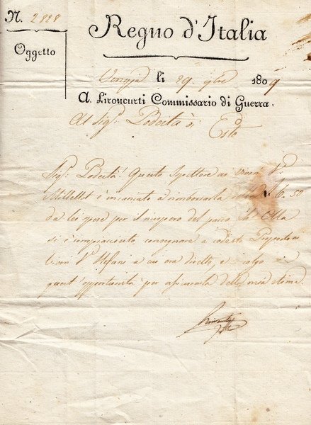 lettera manoscritta e firmata del Commissario di Guerra A. Lironcurti al Podestà di Este datata Venezia, 29 Ottobre 1809 su carta intestata Regno d'Italia; ottimo es.