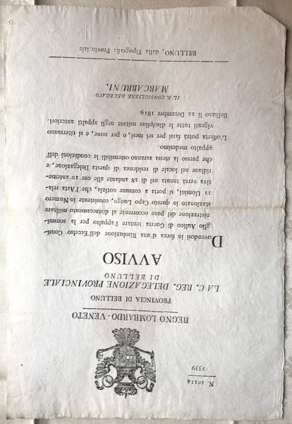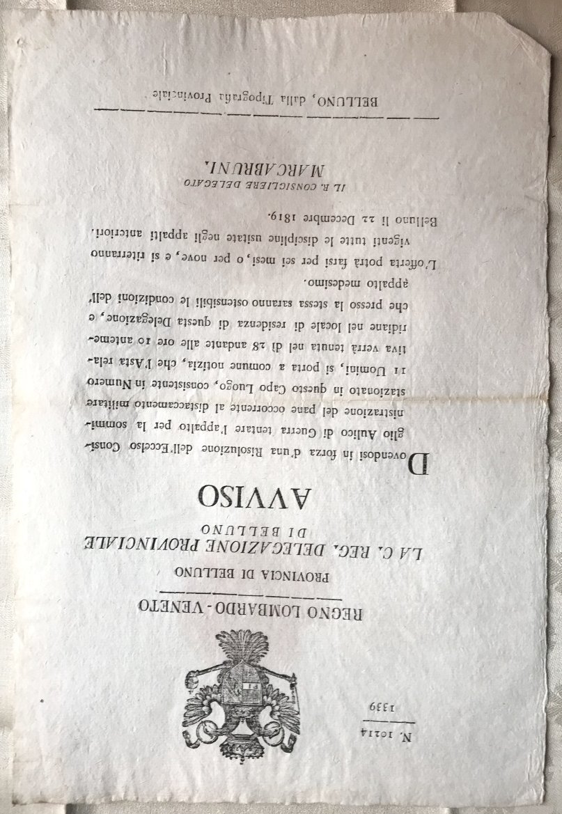 Regno Lombardo Veneto. Provincia di Belluno. La C. Reg. Delegazione Provinciale di Belluno. AVVISO. DOVENDOSI IN FORZA D'UNA RISOLUZIONE DELL'ECCELSO CONSIGLIO AULICO DI GUERRA TENTARE .