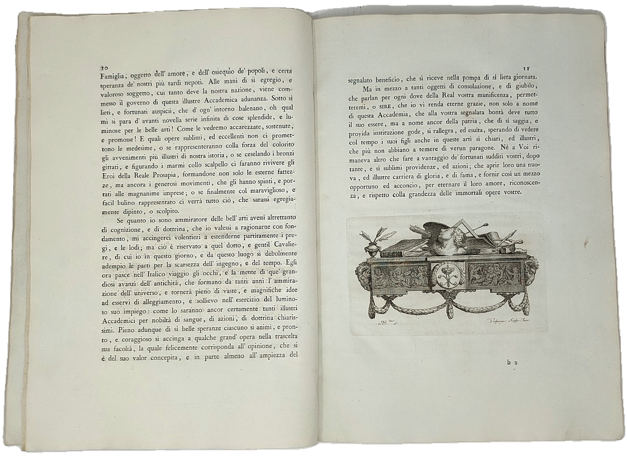 >in-folio, pp. (16, compreso antiporta inciso), 59, (1), leg. coeva in carta decorata (piccoli segni di usura e dorso rinforzato). Corredato di antiporta di Carlo Antonio Porporati su disegno di Ludovico Tesio, raffigurante la Veduta prospettica della Porta di Po tra le figure allegoriche del Po, della Dora e di Minerva, 1 tavola f.t. con medaglie, grande figura sul frontespizio, testatine, finalini e iniziali istoriate, il tutto inciso in rame da A. Valperga. Sono i primi statuti e regolamenti della celebre istituzione torinese. L'Accademia di Pittura e Scultura di Torino venne fondata da una società di pittori, scultori ed architetti piemontesi nel 1593, come aggregato dell'Accademia romana di san Luca e per volontà di Vittorio Amedeo III nel 1778 venne restaurata. Gli Statuti vennero quindi rivisti da Carlo Felice nel 1824 e in seguito l'Accademia fu intestata a Carlo Alberto per ''gli immensi benefizi a lei fatti dal Sovrano''. Esemplare estremamente fresco e marginoso di un raro documento su secoli di vita artistica nella città di Torino. Peyrot 208. Manca a Manno-Promis.