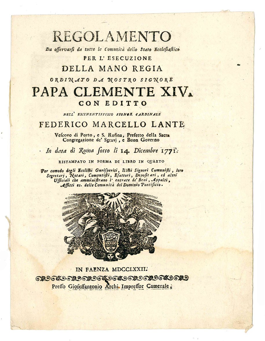 Regolamento da osservarsi da tutte le Comunità dello Stato Ecclesiastico per l'esecuzione della mano regia ordinato da Nostro Signore Papa Clemente XIV. con editto dell'Eminentissimo Signor Cardinale Federico Marcello Lante Vescovo di Porto ... Ristampato in forma di libro in quarto ...