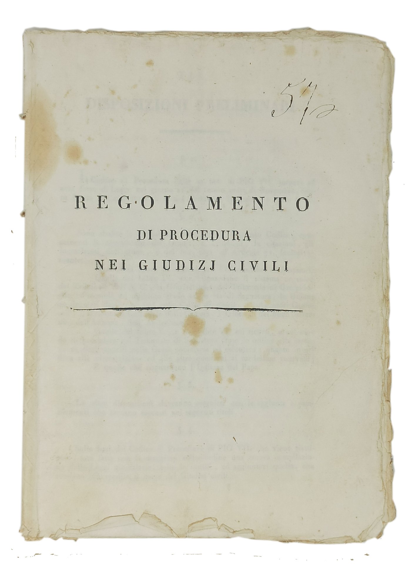 Roma, 1831. Nella Stamperia della Rev. Cam. Apost. Lingua del testo: italiano. Stato di conservazione: Un numero scritto a penna sul margine superiore del frontespizio, sporadici e piccoli segni a margine di paragrafi a pennaminuscoli taglietti sui margini del primo e dell'ultimo foglio, qualche ingiallimento sul frontespizio ma, nel complesso, un buon esemplare. Interno fersco. 'Dato in Roma dalla Segreteria di Stato il 31 Ottobre 1831. T. Card. Bernetti'.