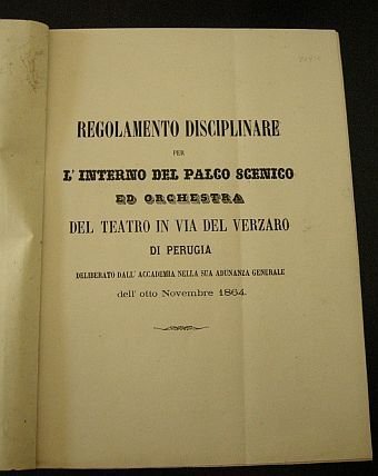 Regolamento disciplinare per l'interno del palco scenico ed orchestra del Teatro in Via del Verzaro di Perugia deliberato dall'Accademia nella sua adunanza generale dell'otto Novembre 1864.