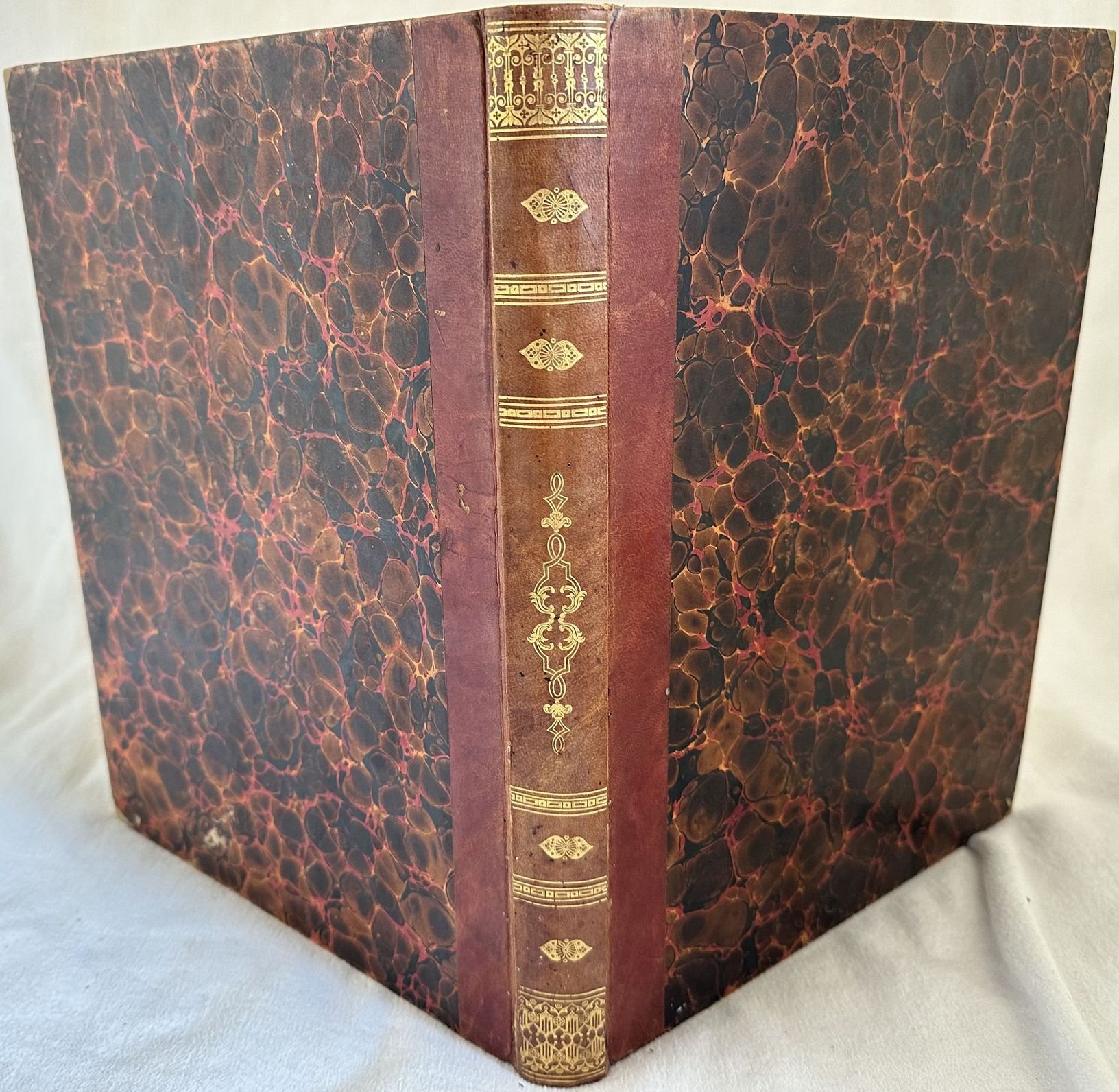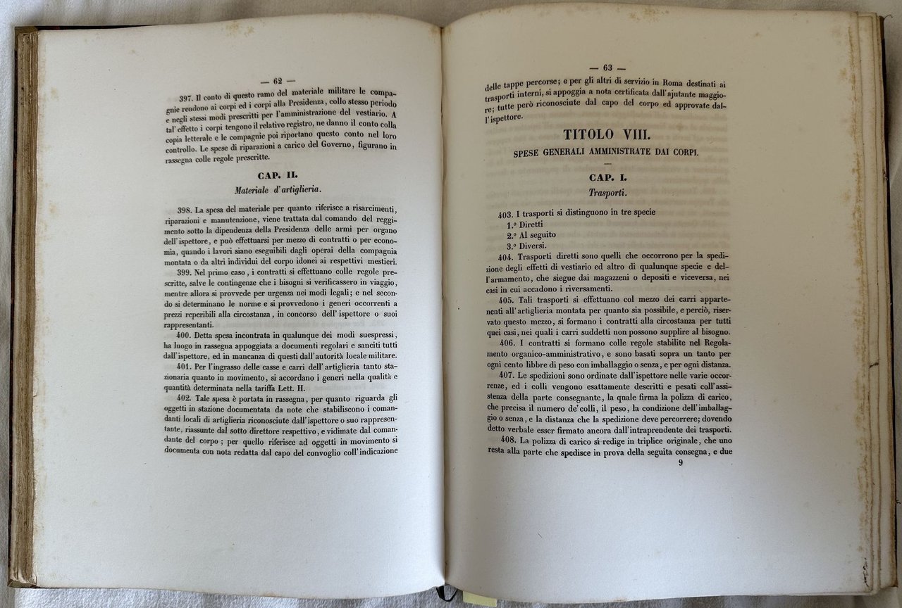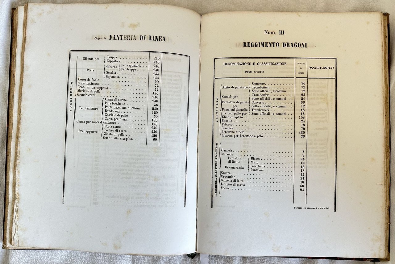 Interessante opera del 1845, regolamento per il dettaglio amministrativo della truppa di linea indigena. All'interno: Disposizioni relative alla forza (reclutamento, cadetti, figli di truppa, diminuzioni per giubilazioni congedi cancellazioni espulsioni diserzioni e morte, disertori arrestati), Registrazione della forza, Competenze degli uomini in posizione ordinaria (Competenze in denaro, pane, vestiario, alloggio, massa, sanità, nettezza, spese d'ufficio), Competenze degli uomini in posizioni diverse, Competenze dei cavalli (Foraggio, bardatura, ferratura e medicatura, nettezza), Materiale dell'armamento e dell'artiglieria, Spese generali amministrate dai corpi (trasporti, nettezza dei forti e corpi di guardia, Culto divino, procedura criminale, piggioni, polveri e munizioni da guerra, regalie alle reclute recapitolari e reintegrati, sovvenzioni e sussidi, spese minute ed imrpeviste), Cavalli di scarto, letame, Amministrazione dei corpi, Consegne dei corpi e delle compagnie, Metodi per l'esercizio degli ispettori nelle riviste e nelle relazioni fra loro ec. Alla fine tabelle allegate con spese, elenco del vestiario e vari oggetti in dotazione per ogni corpo. Segue elenco degli oggetti in dotazione alle caserme, utensili di cucina, mobilio, lumie combustibili, tariffa dei trasporti per la truppa in marcia, modulistica da compilare. In buone condizioni. Copertina in mezza pelle con decorazioni in oro al dorso in ottime condizioni generali con lievi usure ai margini e dorso. Legatura in buone condizioni. All'interno le pagine si presentano in buone condizioni con fioriture. In folio. Dim. 32,5x25 cm. Pp. 111+(100).Interesting work of 1845, rules for administrative details of troop of indigenous line. Inside indication of numbers of soldiers, duties of workers for money, bread, apparels, house, health, office expenses, Horses, administrative expenses for bodies, Divine cult, criminal procedure, weapons ec.), Administration of bodies ec. At the end enclosed charts with expenses, elist of clothes and different items for each body. Then list of furniture for each building, kitchen tools, lights and oils, fee of transport for troop in march ec. In good conditions. Half leather coeval cover with gilted decorations in the spine in the spine in very good general conditions lightly worn in the extremities. Binding in good conditions. Inside pages are in good conditions with foxing. In folio. Dim. 32,5x25 cm. Pp. 111+(100).