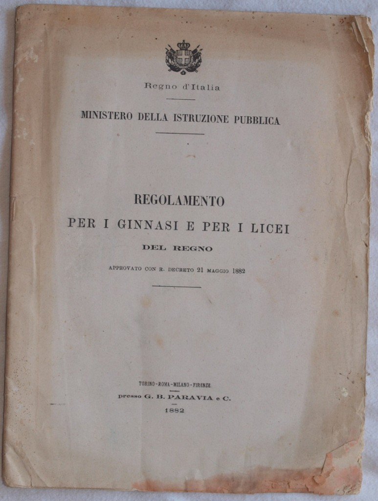 In 8. Dim. 22x16,5 cm. Pp. 29. Interessante pubblicazione del 1882, il regolamento per i ginnasi e per i licei del Regno edita a cura del Ministero della Istruzione pubblica del Regno d'Italia. Nell'ultima pagina orario del ginnasio e del liceo con ore settimanali. In discrete condizioni. Brossura editoriale in mediocri condizioni generali con usure e parti mancanti ai margini e dorso. Legatura in buone condizioni. All'interno le pagine si presentano in discrete condizioni con rare fioriture. Lieve gora d'umidità all'angolo inferiore destro. Interesting pamphlet of 1882, the rules for the high schools of the Reign edited by Ministery of the public education of the Italian Reign.In the last page hours of the high school with weekly hours. In fair conditions. Editorial cover in poor general conditions with wearings and missing parts in the edges and spine. Binding in good conditions. Inside pages are in fair conditions with occasional foxings. Slight humidity stain in the lower right corner.