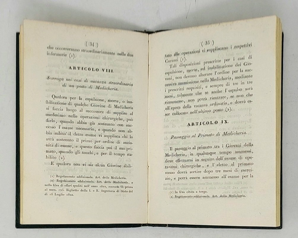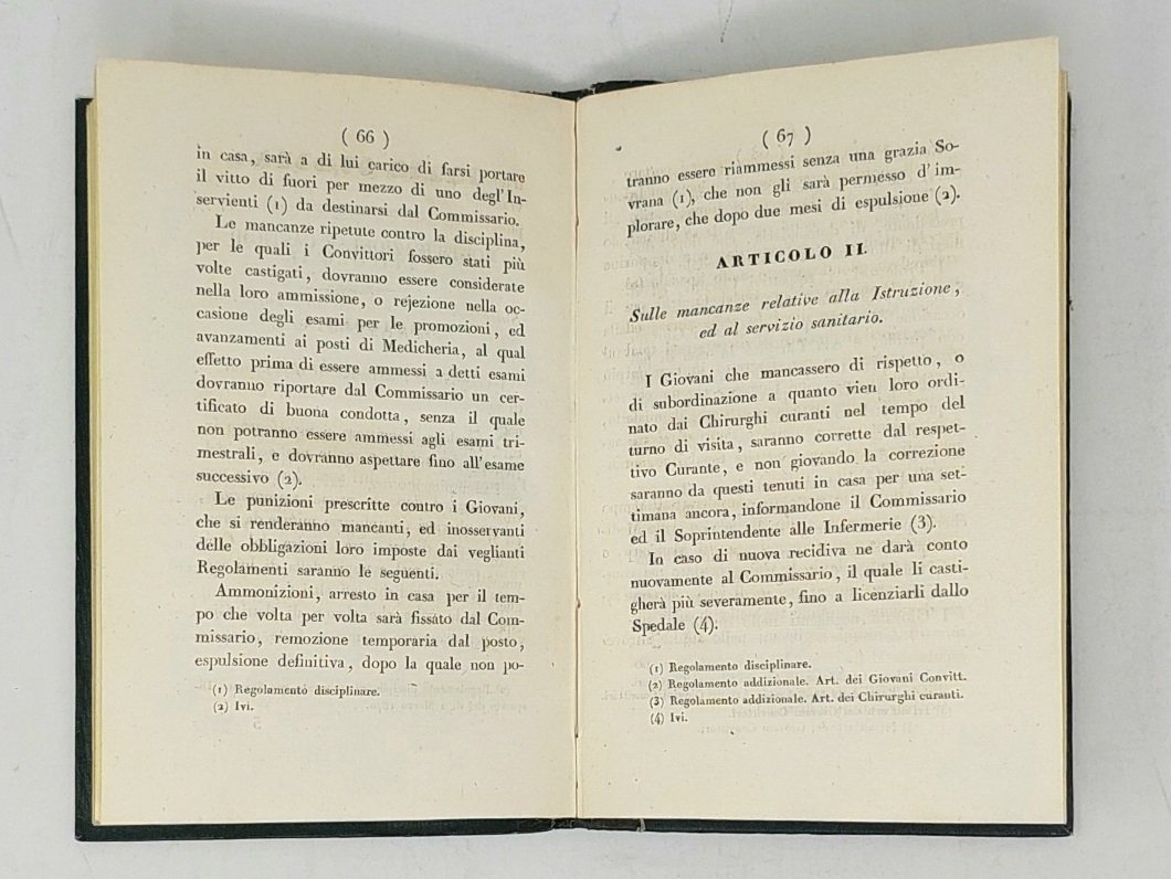 >in-16, pp. (70), (8). Legatura mezza pelle, titolo oro e fregi al dorso (piccole mancanze). Il presente regolamento risulta così suddiviso: Ammissione e disciplina; Servizio Interno; Istruzione; Mortificazioni, e Castighi. Buon esemplare.
