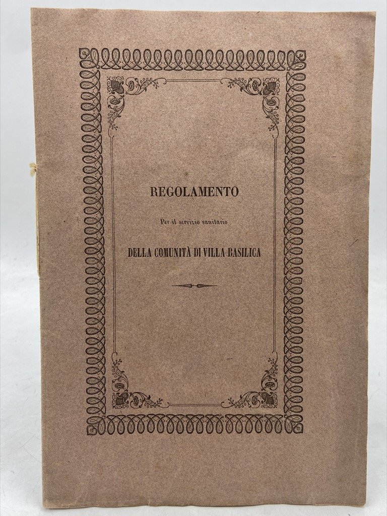 Brossura editoriale a stampa con cornice tipografica, in ottavo cm 22 x 15, pp 16. Lievi fioriture e difetti. L’opuscolo contiene il regolamento, redatto dal Gonfaloniere F. Sari e dal segretario M. Pollera, per il servizio sanitario «a benefizio dei poveri e miserabili, ed in parte anche a benefizio dei possidenti» nel comune di Villa Basilica, con le disposizioni per il personale composto da tre medici chirurghi, una levatrice e tre farmacisti.