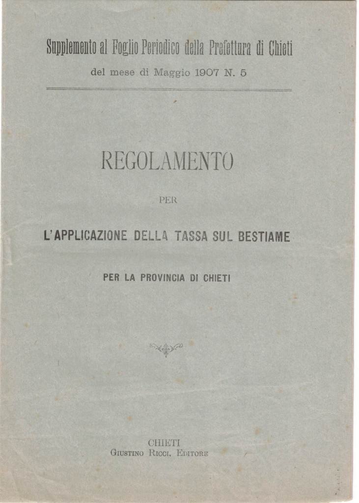 Regolamento per l’applicazione della tassa sul bestiame per la Provincia di Chieti, Giustino Ricci Editore, Chieti s.d. (ma 1907), pp. 9, cm 23, rilegatura ed. a punto metallico. Descrizione effettuata sulla base della prima di copertina. In testa alla prima di copertina: Supplemento al Foglio Periodico della Prefettura di Chieti del mese di maggio 1907, n. 5. Lievi tracce d’uso, minime fioriture, leggera brunitura della carta, per il resto ben conservato.