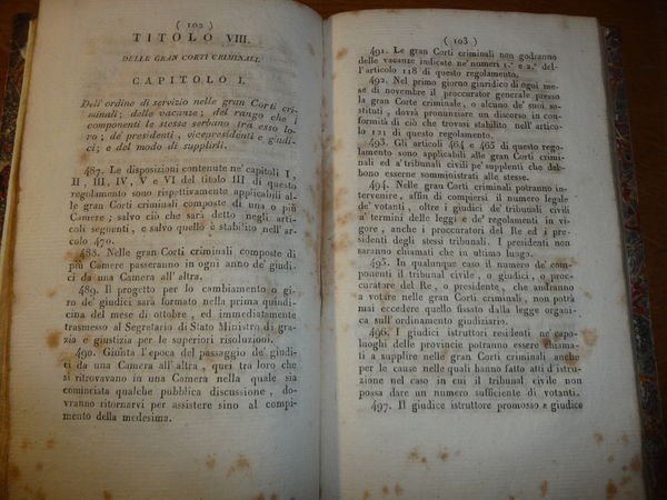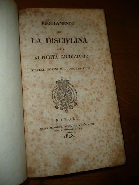 DESCRIZIONE: Nella stamperia della Pieta' de' Turchini strada Medina n. 17, Napoli 1828 ril. coeva in mz pelle con tit. in oro al dorso pp. 234 xilografia dell'arma borbonica al frontespizio, in 8° p. Il regolamento è diviso in 17 titoli: 1.De conciliatori 2.De giudici di circondario 3.De tribunali civili 4.De tribunali civili investiti delle funzioni di tribunali di commercio 5.De' tribunali di commercio 6.Delle Gran Corti civili 7.De' giudici istruttori 8.Delle Gran Corti criminali 9.Delle Gran Corti speciali 10.Della Corte suprema di giustizia 11.Del ministero pubblico 12.Delle cancellerie 13.Degli uscieri 14.De portieri e de custodi de tribunali 15.Misure di disciplina e de' funzionari che vi sonos oggetti 16. Della norma de tenersi per la prestazione del giuramento degl'impiegati aooartente all'ordine giudiziario 17.Disposizioni generali.? CONDIZIONI: Buone/Ottime lievi abrasioni generali, ma molte tracce di fox all'inerno. PESO / WEIGHT: 311 gr. without package