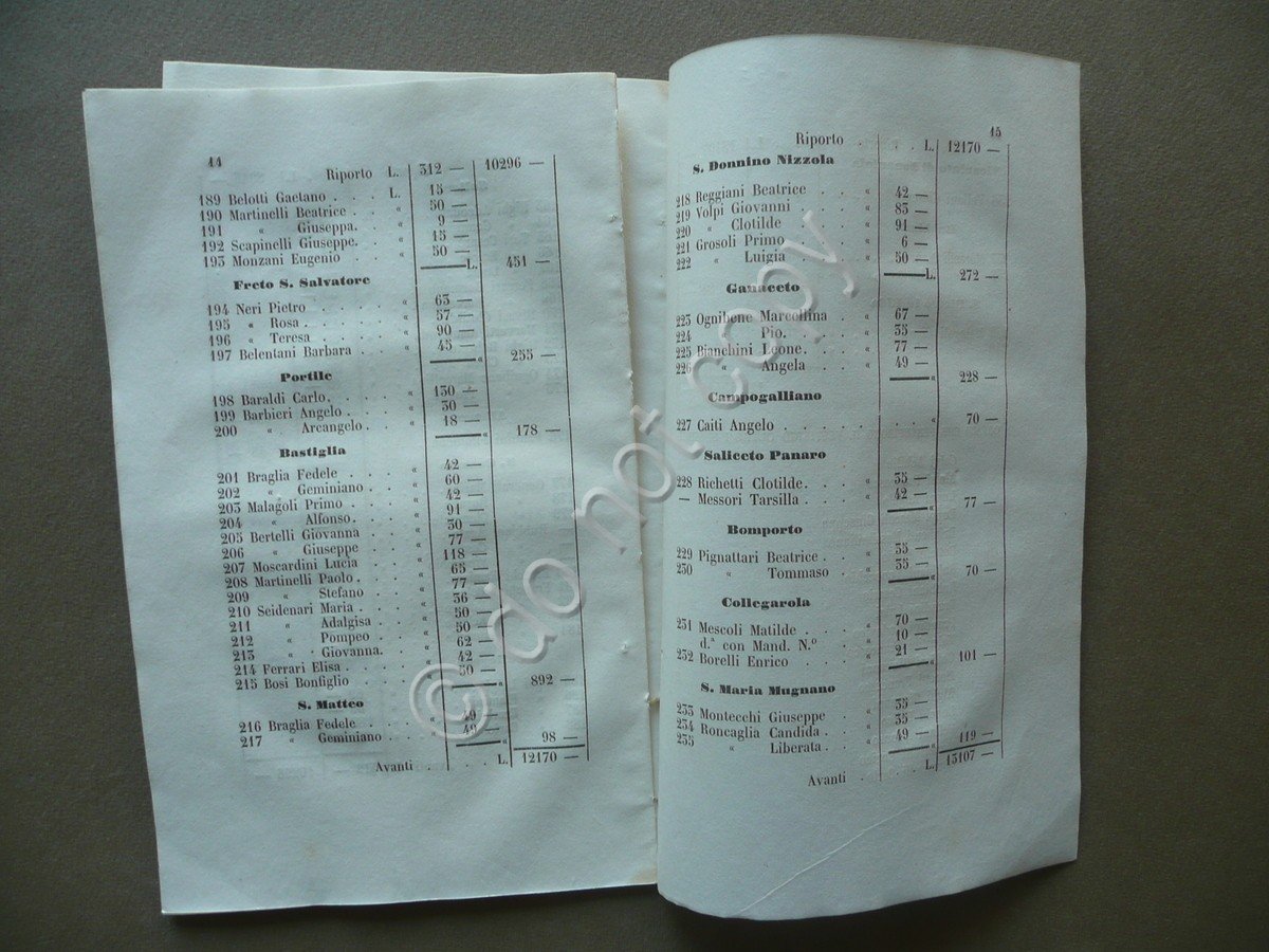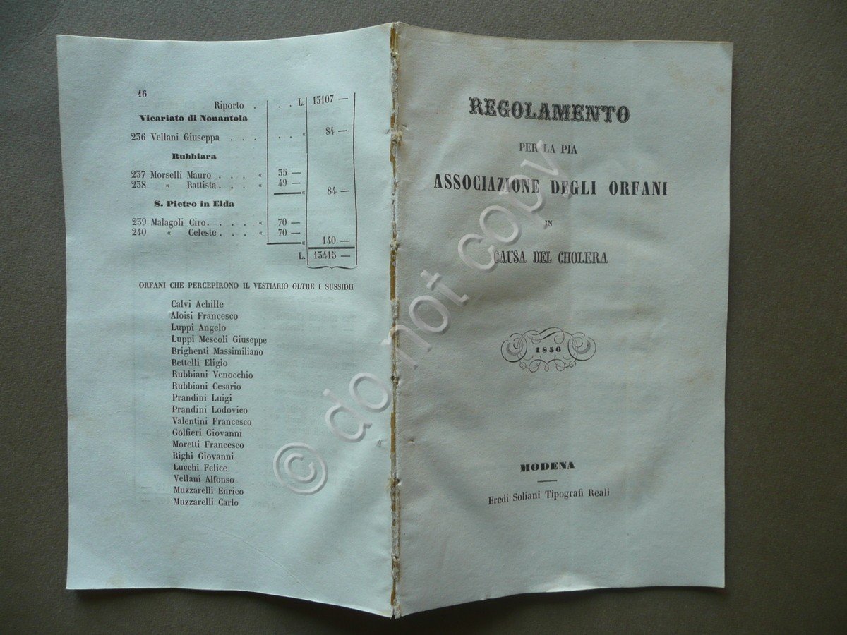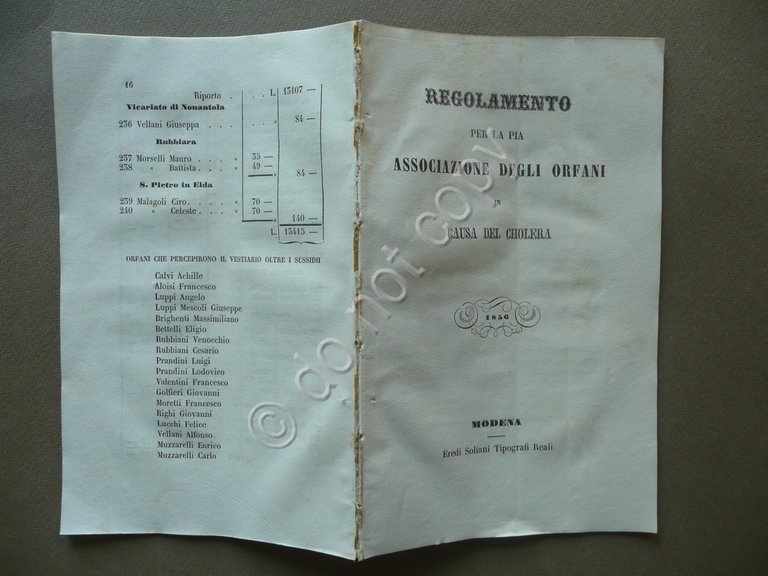 Opuscolo, Regolamento per la pia associazione degli orfani in causa del cholera 1856 Eredi Soliani Tipografi Reali, Modena 1856, cm 21x13, pp. 1-28 (regolamento); pp. 1-16 (resoconto della pia associazione ai soci per dimostrare rendite e spese), mancanza della brossura. Condizioni di conservazione Esemplare complessivamente in buone condizioni con tracce d'uso, mancanza della brossura ma esemplare compatto, dorso con tracce della precedente legatura, frontespizio e qualche pagina con poche minime bruniture, pp. 3-14 del resoconto parzialmente staccate dal corpo del testo. OPEB.2211 N