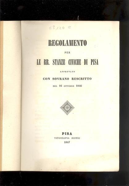 REGOLAMENTO PER RR. STANZE CIVICHE DI PISA.<BR>APROVATO CON SOVRANO RESCRITTO DEL 16 OTTOBRE 1846.