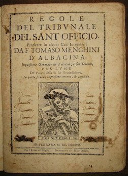 Regole del Tribunale del Sant’Officio praticate in alcuni casi immaginarij da F. Tomaso Menghini d’Albacina Inquisitore generale di Ferrara, e suo Ducato, per lume de’ Vicarij della di lui Giurisditione. In questa seconda impressione corrette, & ampliate
