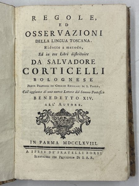 REGOLE, ED OSSERVAZIONI DELLA LINGUA TOSCANA. Ridotte a metodo, ed in tre Libri distribuite da SALVADORE CORTICELLI BOLOGNESE.