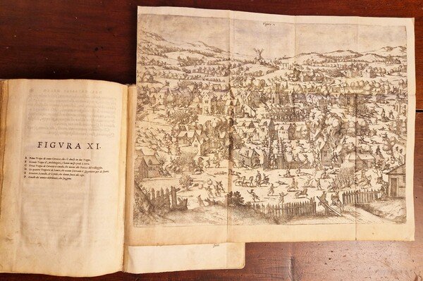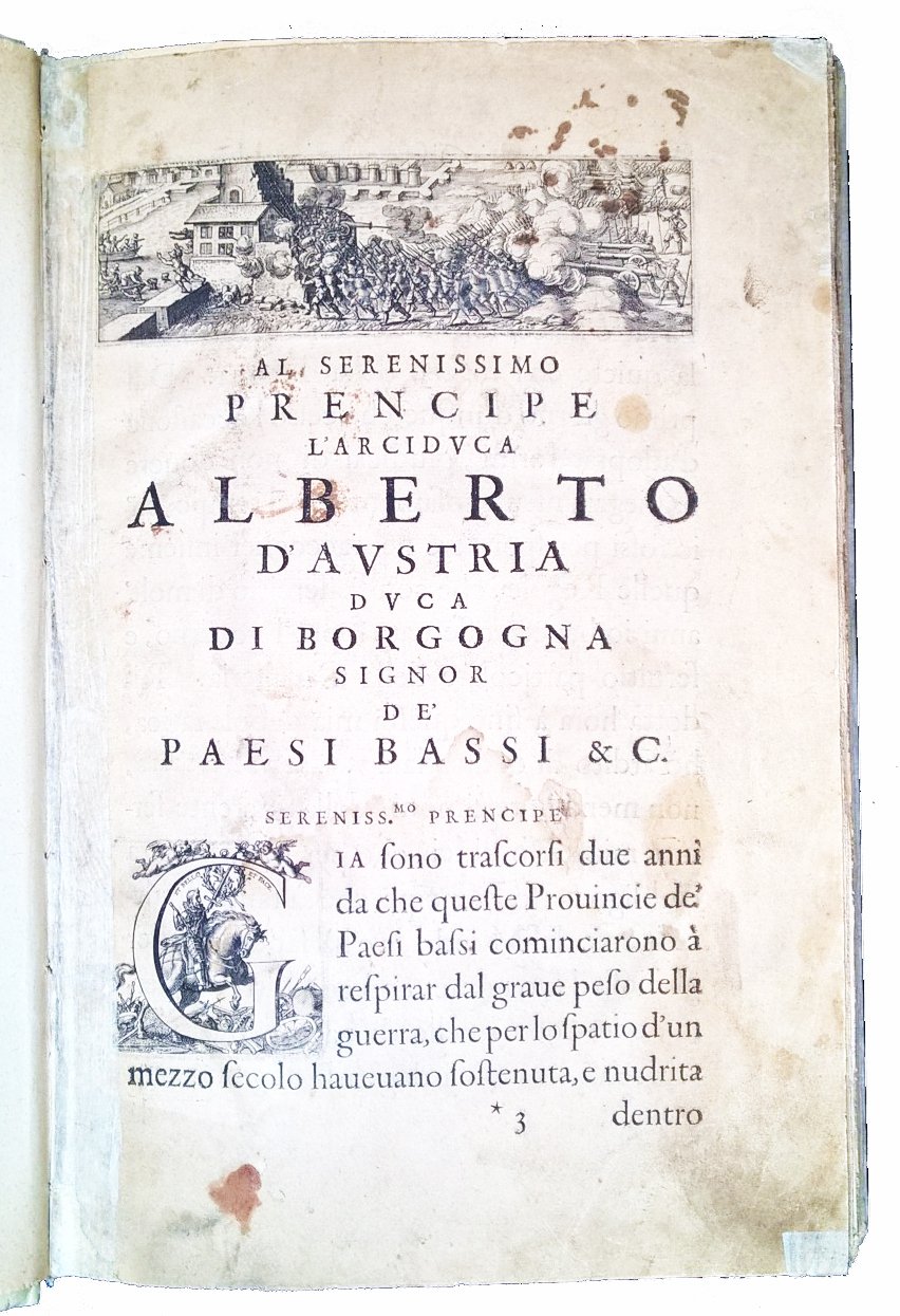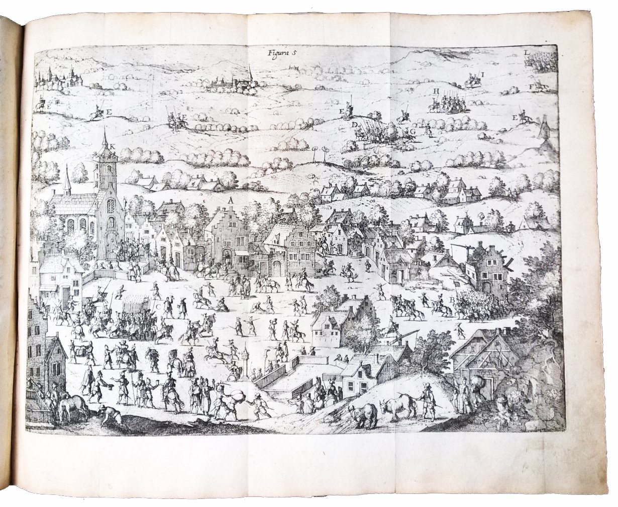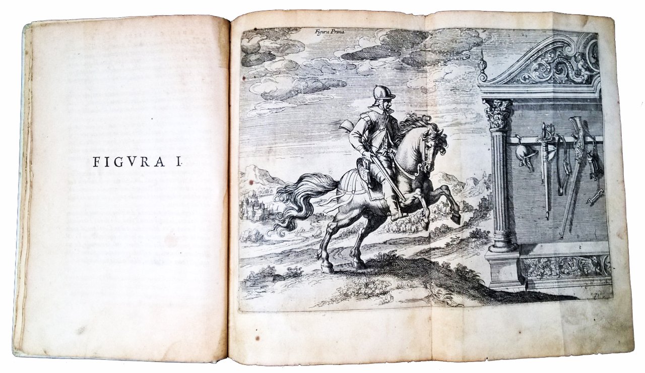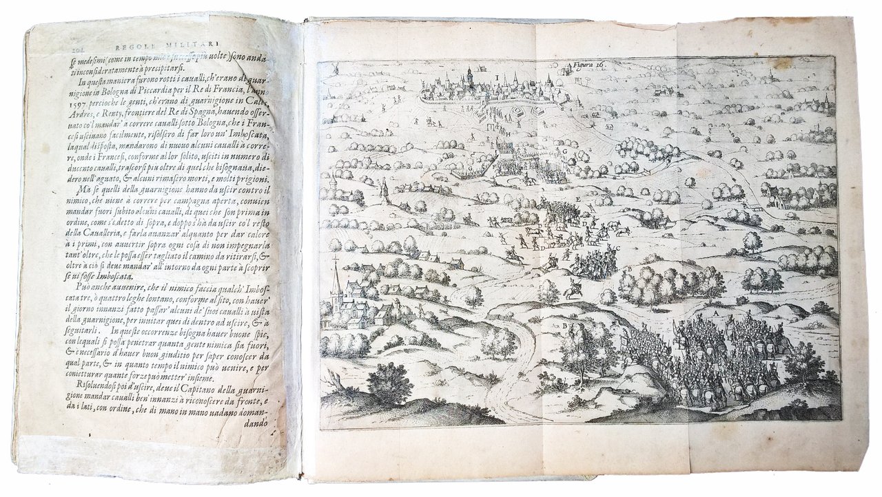 in-folio, 300x194 mm, leg. moderna in piena pergamena con titolo dorato su tassello in pelle rossa al dorso e filetti dorati ai piatti e al dorso; pp. [12], 221, [3], [4 b.], [15] c. di tav. calcogr. ripieg.; numerose illustrazioni nel testo. In questo esemplare mancano le prime due carte (la *1 e la *2), la carta *6, le pp. da 205 a 221 e le ultime 7 pp. non numerate, comprese le 4 bianche. Grandi iniziali arricchite con incisioni su rame di tema bellico; 16 figure su 15 tavole egualmente incise su rame, su doppio foglio o ripiegate fuori testo, raffiguranti cavalieri con armi ed armature, truppe, schieramenti, piani d'attacco e di difesa. Testate e finali calcografici. Dedica dell'Autore all'arciduca Alberto d'Asburgo. Prima edizione di questa trattazione pratica di cavalleria e tattica militare, basata sulle esperienze maturate su campo e con molti esempi di vita vissuta da Lodovico Melzi (1558-1617), Cavaliere di Malta, generale italiano della cavalleria leggera di Fiandra e Brabante. L'opera si articola in cinque libri e diversi capitoli per argomento che seguono una logica sistematica. Rif.: IT\ICCU\VEAE\002628. OCLC, 315738408. Cond.: Riparazioni ai margini di molte carte; bruniture e fioriture, macchie di umidità. Copia incompleta (mancano i due frontespizi e altre 13 carte), ma con tutte le tavole. Nel complesso, trattasi di un discreto esemplare. -- First edition of this important early 17th century work on military horsemanship and military tactics, based on the experience gained in the field and with many examples of life lived by Lodovico Melzi (1558-1617), an Italian general of the light cavalry of Flanders and Brabant. Three of the very fine double-page plates depict armoured soldiers on horseback each approaching a display of their personal weapons and armour on a row of pegs. The other, very lively plates all show bird's-eye overviews of landscapes and villages with cavalry activities. Incomplete copy (the two title-pages here missing, together with other 13 leaves), repaired at many leaf-edges, with brownings, waterstains and spots; overall, a fair copy.