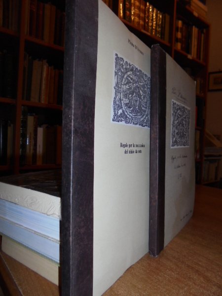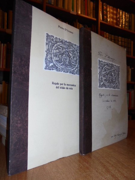 Pietro, D' Avanzo. Venezia, Corbo e Fiore Editori e stampatori in Venezia, 1981. Regole per la meccanica del telaio da seta. 2 volumi in-8° grande, cartonato edit. (cm. 29 x 20). I° vol.: pp 70 di t. con tavv a colori ripieg.; II° vol.: pp 107 di t., alcune tavv b/n nel t. Il secondo volume è una riproduzione anastatica di un manoscritto del Settecento (1753) nel quale sono raccolte, in modo singolare e unico, le regole per la fabbricazione dei tessuti di pregio in uso in quel tempo. In ottimo stato di conservazione. Neg. natura