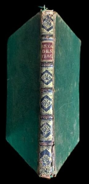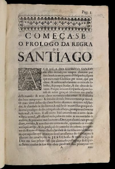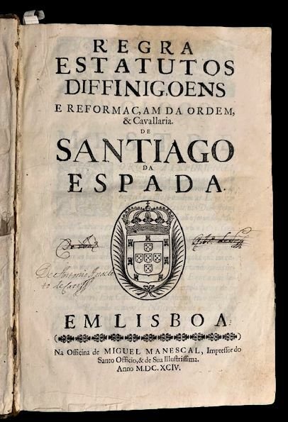 In 4° (27,5x18,5 cm); (8), 219 [i. e. 218], (2, una contenente l'errata) pp. Legatura coeva in piena pelle maculata con titolo in oro su fascetta in pelle rossa ad un tassello. Dorso a 5 nervi con ricchi fregi in oro ai tasselli. Una fessurazione nel margine basso della cerniera del piatto anteriore ma nel complesso, legatura salda ed in buone condizioni di conservazione. Complete, only the white card Oiii is missing, never added in this copy. Errors in pagination: no pages numbered 63, 65; two pages numbered 112. Mancante della carta bianca Oiii solitamente posta dopo pagina 106, nel nostro esemplare mai aggiunta. Pagina 112 ripetuta due volte ma con richiamo a piè di pagina corretto. Il nostro esemplare segue perfettamente le copie digitalizzate se non, appunto, per l'assenza della carta bianca Oiii bianca. Bella legatura coeva in piena pelle. Dorso a 5 nervi con titolo e fregi impressi in oro ai tasselli (piccola mancanza al margine superiore alto, leggere strofinature e una cerniera leggermente lenta). Antiche firme di appartenenza privata al frontespizio, una anticamente cancellata ma ancora leggibile che identifica l'esemplare come appartenuto De Antonio Anacleto Caruss e De Iua. Rib. De Sass (?). Bella marca con stemma araldico del Portogallo al frontespizio. Marca tipografica dello stampatore a pagina 191 e a pagina 219. Numerose iniziali, testatine e finalini ornati. Storia e statuti di uno dei più celebri ordini cavallereschi europei. L'Ordine dei Cavalieri di Santiago de la Espada fu fondato nel 1167 e riconosciuto da Papa Alessandro III nel 1170. Tale ordine si prefiggeva di proteggere i pellegrini dalle frequenti scorrerie arabo-musulmane; uno scopo simile anche ad altri Ordini sorti in periodo di crociate, quali i Templari e gli Ospitalieri. All'interno buono-ottimo stato di conservazione. Da pagina 28 a 36 il testo della "Bulla" di papa Alessandro III che sancisce la fondazione dell'ordine. Alcune antiche note e sottolineature di mano seicentesca nel testo. Tagli spruzzati in rosso. Rarissimo statuto dell'Ordine cavalleresco di Santiago che ne ripercorre la storia dalla fondazione fine all'anno 1694. Good copy, rare. Rif. Bibl.: Numero OCLC: 974566373; Carvalho, M. Dic. bibliogr. militar port. 227; Cunha, X. Impr. deslandesianas 640; Palha 2577; Condessa de Azambuja 715; Monteverde 4416; Samodães 2660; Ameal 1906; Avila; Perez 6268; Marinha. Impr. séc. XVII 590; Arouca R 153.