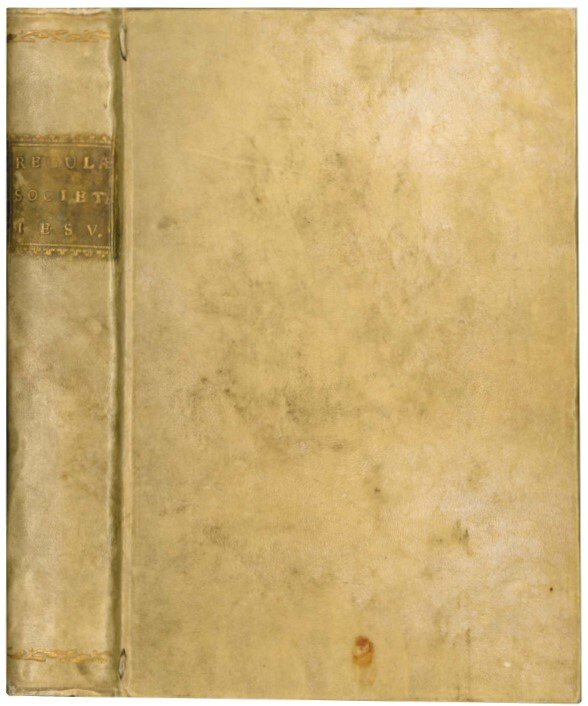 In-8vo (mm. 148x99). Pp. 276, [52]. Segnatura: A-V⁸ X⁴ (ultima c. bianca). Emblema xilografico dei Gesuiti al frontespizio, iniziali xilografiche. Esemplare uniformemente brunito. Pergamena rigida coeva con titolo e fregi decorativi incisi in oro al dorso, segnalibro in raso verde.
