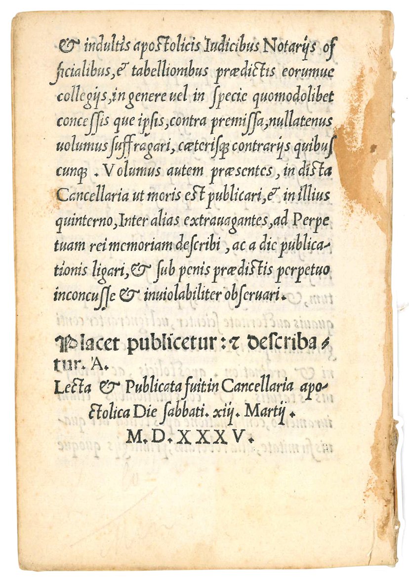 In 8vo (mm 147x199); pp. [8]. Stemma xilografico di papa Paolo III al recto della prima carta, capolettera xilografico. Informazioni tipografiche al verso dell'utima carta. Piccolo forellino nella parte centrale della terza carta, che lambisce solamente il testo. Lievi fioriture marginali. Non rilegato.