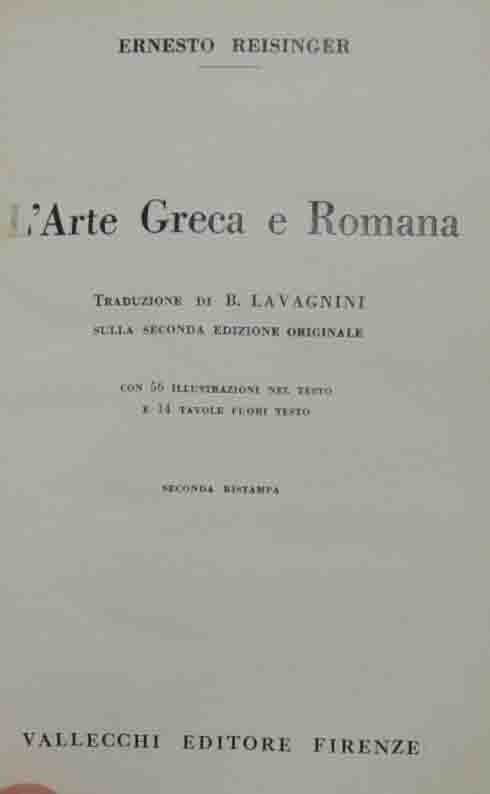 Ernesto Reisinger, L’arte greca e romana, traduzione di B. Lavagnini sulla seconda ed. originale, Vallecchi Editore, Firenze 1931, seconda rist., pp. 95, 17 c. di tavv. f.t. ill. b.n. e col., cm 19, legatura in mezza tela con titoli manoscritti al dorso. Collana Civiltà classiche. Firma d’appartenenza e data all’occhiello. Minime tracce d’uso alla legatura, fioriture ai tagli e a prime e ultime carte, per il resto molto ben conservato.