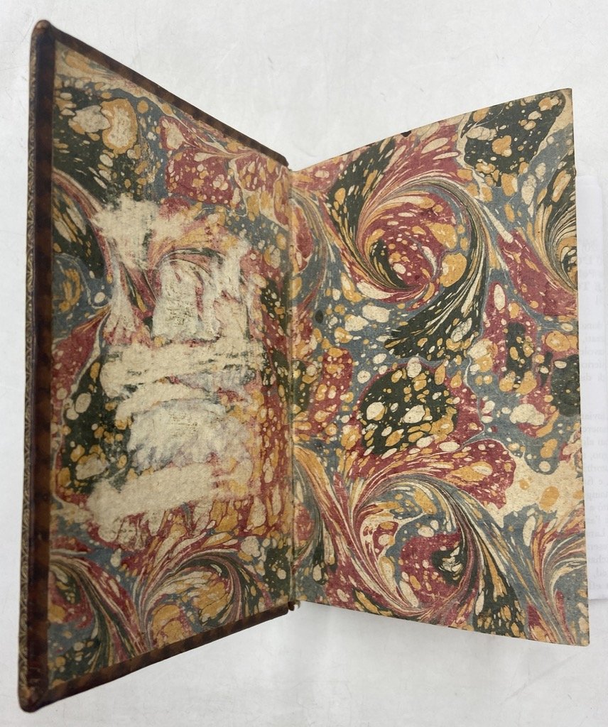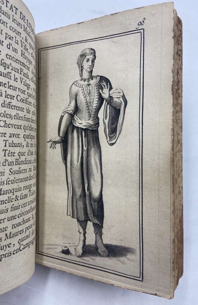 Legatura coeva in tutta pelle, fregi titoli dorati sul dorso a cinque nervi, sguardie marmorizzate (tracce di ex libris rimosso sull’anteriore) e tagli marezzati, in dodicesimo cm 16x10, pp (16) 227 (5), frontespizio parzialmente rubricato, antiporta e 9 tavole incise di cui una ripiegata, una carta bianca in apertura e in fine. Piccola gora bruna sull’angolo inferiore destro del margine delle pagine da 127 a fine volume, sempre ben distante dal testo; tracce di distacco di ex libris sulla prima sguardia; ben conservato per il resto. Relazione dell’ambasceria del Cavaliere di S. Olon, inviato da Luigi XIV presso il Sultano alawide Mulay Ismail (1645-1727) per concludere un’alleanza commerciale che avrebbe incluso tra l’altro uno scambio di prigionieri e la reciproca assistenza contro i pirati algerini e ottomani. S. Olon sbarcò a Tétouan ad aprile 1693 ed incontrò il Sultano a Meknès a giugno, ma la ratifica dell’accordo non fu ultimata - addirittura l'ambasciatore fu brevemente imprigionato dalle autorità di Tétouan. La relazione apparve già nel 1694, col titolo di Estat Present de l’Empire de Maroc, e fu ristampata l’anno seguente in questa edizione arricchita dell’apparato inciso da Daniel met de Penningen, nativo di Anversa e attivo ad Amsterdam dal 1685 alla morte nel 1696; il successo dell’opera portò a traduzioni in inglese e olandese entro la fine del secolo XVII. Le tavole incise sono in tutto dieci: l’antiporta raffigurante l’incontro tra S. Olon e il Sultano, la pianta ripiegata della città e fortezza di Larache (riconquistata da Mulay Ismail nel 1689), e alcune immagini di costumi (4 semplici e 4 che presentano 2 figure ritratte sia di fronte sia di spalle). «The author was sent by Louis XIV. to effect an exchange of slaves, and to conclude a treaty of peace and alliance against the Algerines. He disembarked, in the Bay of Tetuan and met the Sultan at Mekenes, but he had to leave the country without effecting his object. He was even imprisoned for some time at Tetuan by the Kaid of that place.» R. Lambert Playfair, A Bibliography of Morocco, n. 308. Boucher de la Richarderie IV, p. 46.