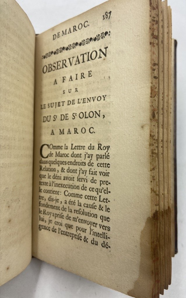 RELATION DE L’EMPIRE DE MAROC. OU L’ON VOIT LA SITUATION DU PAYS, Les moeurs, Coûtumes, gouvernement, Religion & Politique des habitans. Par Mr. DE S. OLON Ambassadeur du Roy à la Cour du Maroc. LE TOUT ENRICHI DE FIGURES. A PARIS, Chez la Veuve Mabre Cramoisy. M. DC. XCV.
