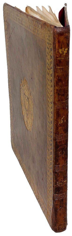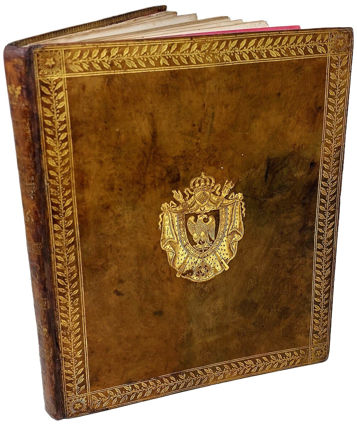 Elegante ed artistica legatura del tempo in pieno vitello marmorizzato, larga bordura dorata ai piatti, al centro dei quali è impresso in oro il grande stemma Napoleonico, dorso ornato con ferri emblematici dello stesso, tagli dorati. Abili restauri alle cerniere ed agli angoli.