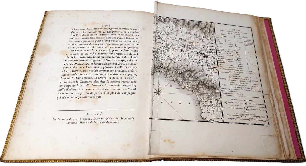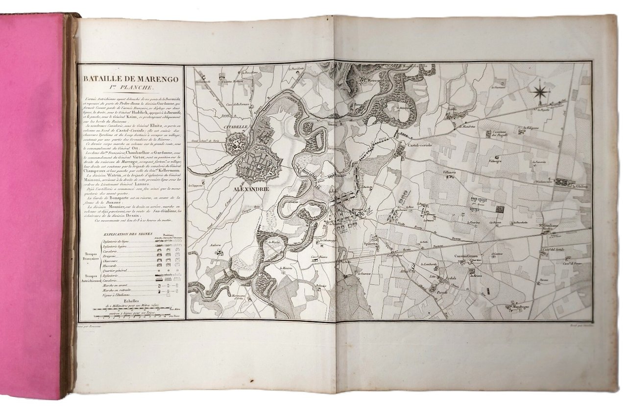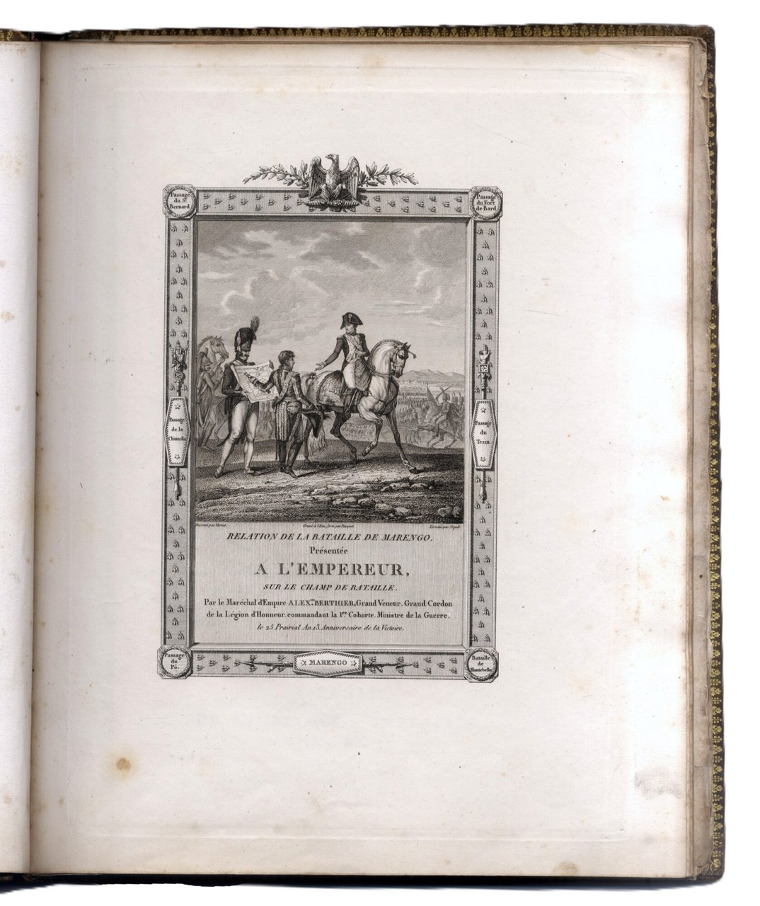 Edizione originale della dettagliata relazione sulla famosa battaglia di Marengo (Alessandria) del 14 Giugno 1800, vinta dai francesi comandati da Bonaparte e Berthier sulle truppe Austriache, redatta dal generale Berthier e dedicata all'Imperatore. Lo stesso Napoleone diede ordine a Beauharnais di provvedere alla traduzione in italiano che fu poi eseguita dal Foscolo e stampata poi in pochissimi esemplari. Volume stupendamente impresso ed illustrato (qualche fioritura).