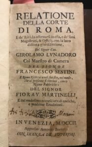 RELATIONE DELLA CORTE DI ROMA E DE’RITI DA OSSERVARSI IN ESSA….DEL SIG. CAV. GIROLAMO LUNADORO COL MAESTRO DI CAMERA DEL SIGNOR FRANCESCO SESTINI E ROMA RICERCATA NEL SUO SITO…DEL SINOR FIORAV. MARTINELLI.