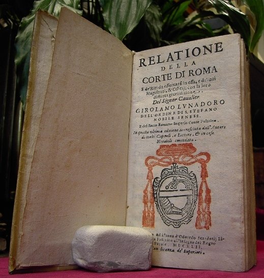 Volume in 12, legatura coeva in pergamena morbida, titolo manoscritto al dorso, sguardie, frontespizio con Stemma cardinalizio in rosso e nero, forse del dedicatario (Giovan Battista Pallotto, card.), dedicatoria, prefazione, sommario, (12) 273, bianca finale. Eccezionale e rara edizione di un opera particolare e specialmente curiosa. L' autore, senese, ottenne il titolo di cavaliere milite, all'Ordine di S. Stefano (Ordine fondato da Cosimo I de' Medici nel 1561) all'interno del quale ag come rappresentante nel Regno, difendendo. Forte della sua esperienza presso la corte pontificia, il Lunadoro aveva scritto nel 1611, su incarico della granduchessa Cristina di Lorena, una Relatione della corte di Roma e de' riti da osservarsi in essa, e de' suoi magistrati, e offizi, con la loro distinta giurisdittione. L'opera, che doveva servire di istruzione per Carlo de' Medici, figlio di Cristina, destinato al cardinalato, fornisce un quadro dettagliato dell'organizzazione della corte pontificia, delle gerarchie, delle mansioni di ciascun funzionario di governo, dei riti, delle cerimonie e delle forme da rispettare in ogni situazione. Considerata a lungo il manuale del cerimoniale pontificio, circol in numerose copie manoscritte senza che l'autore si preoccupasse di farla stampare. Nel 1621 Francesco Sestini da Bibbiena, anch'egli maestro di camera del cardinale Cinzio Aldobrandini, ne fece una parziale edizione a suo nome, intitolandola Il maestro di camera. Solo nel 1635 il nipote dell'autore, Romolo Lunadoro, la fece stampare integralmente a Padova da Paolo Frambotto, dedicandola al cardinale Carlo de' Medici, per il quale in origine era stata composta. La seconda edizione f stampata a Bracciano nel 1641 ed un anno dopo, la presente f stampata a Viterbo. Dopo queste rarissime ed ormai introvabili edizioni l'opera venne ristampata, affiancata ad altre opere, fino alla met dell'Ottocento a testimonianza del successo ottenuto. E' inoltre significativo che, Gregorio Leti, avvezzo a usare concetti di opere altrui, utilizz ampiamente la Relatione (per la seconda parte del suo Itinerario della corte di Roma, 1673), pur dichiarandolo esplicitamente. Da ci forse l'equivoco, tuttora persistente, ma insostenibile se non altro per ragioni anagrafiche, che gli attribuisce l'opera del Lunadoro. L'opera, di gradevolissima lettura, interessante e davvero curiosa, qui presentata in splendide condizioni, la pagina 91 (evidentemente scomparsa al momento della legatura) stata rimpiazzata all'origine, da una stessa fittamente e magistralmente manoscritta, in un corsivo romanico cos ben ripreso ed un impaginazione perfetta da rendere difficile la distinzione con la pagina stampata a fronte, una peculiarit anzich un difetto. Esemplare raro, in bello stato ed in bella legatura.