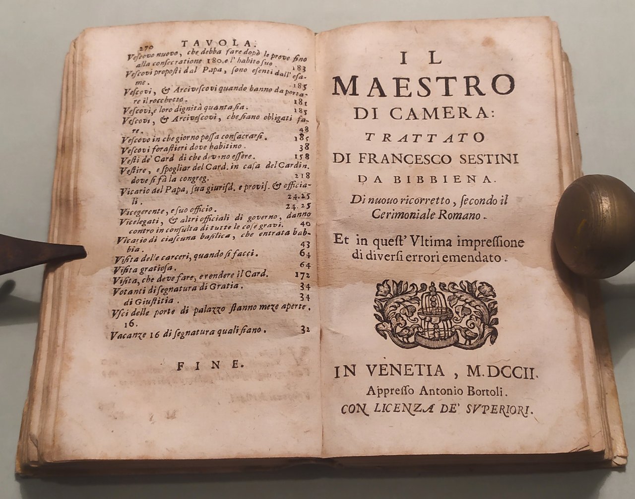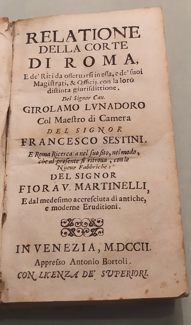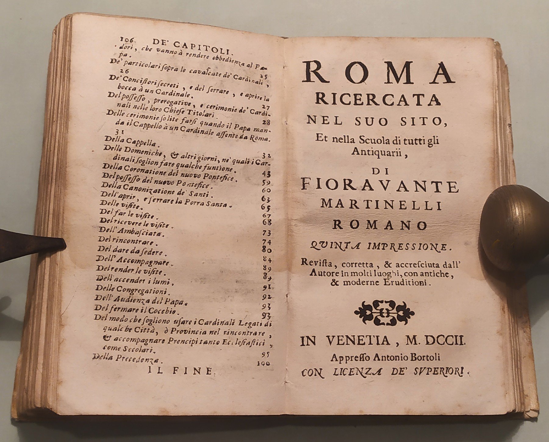 Relatione della Corte di Roma e dé riti da osservarsi in essa, e dé suoi magistrati e officii, con la loro distinta giurisdizione. Col maestro di camera Francesco Sestini. E Roma ricercata nel suo sito, nel modo che al presente si ritrova, con le nuove fabbriche del signor Fioravante Martinelli e dal medesimo accresciuta di antiche e moderne eruditioni. Venezia, Antonio Bortoli, 1702. Tre opere in un volume in 16mo; pp.270, 106, 184 ed index. Pergamena coeva stanca, titolo calligrafato al dorso.