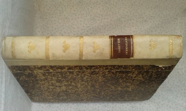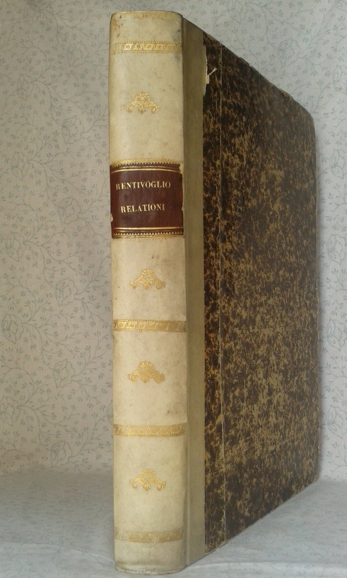 Due tomi in un volume in 4 grande, elegante legatura in mezza pergamena, titolo al tassello in pelle al dorso ornato da fregi in oro, sguardie, frontespizio silografico con titolo entro monumentale cornice architettonica (ex-libris manoscritto al margine inferiore), dedicatoria alla principessa di Spagna, occhiello, dedicatoria al Cardinal Borghese, sommario del primo tomo, 10 cc., 212 pp., 11 cc. di indice, 1 carta bianca, occhiello e sommario al secondo tomo, 179 pp, 1 bianca, 6 cc. di indice, bianca finale. Importante e rara edizione originale delle Relazioni del cardinale Bentivoglio, grande diplomatico, letterato, uomo di stato e di chiesa. Formatosi a Padova, Bentivoglio successivamente intraprese una brillante carriera ecclesiastica e su disposizione di Paolo V assunse il ruolo di ambasciatore pontificio dapprima nelle Fiandre e poi a Parigi. Questo lavoro contiene una relazione storica e geografica delle Provincie unite di Fiandra, una descrizione degli avvenimenti civili, bellici e religiosi dei Paesi bassi, in relazione ai maggiori stati europei. Leloquente contenuto di queste relazioni former pi tardi il testo Delle Guerre di Fiandra. Bellesemplare, ben conservato, una soffusa brunitura dovuta al tipo di carta, un piccolo ricamo di tarlo al margine inferiore bianco, alle prime cinque carte del secondo tomo. Prima rarissima edizione. Preziosa.