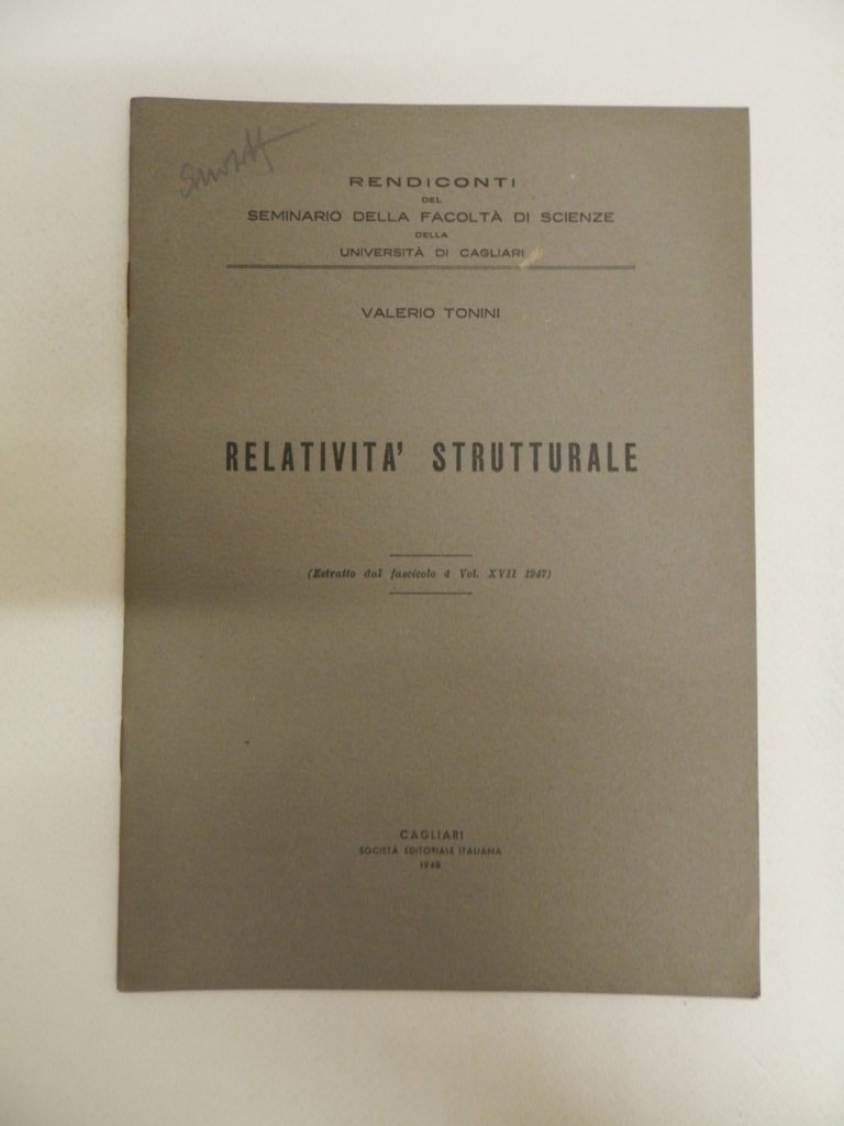 8°, pp. 24, brossura editoriale, titolo al piatto, rendiconti del seminario della Facoltà di Scienze della Università di Cagliari. in questo opuscolo vene proposta la Relatività strutturale che supera il dilemma dei due modelli unilaterali di Einstein e di Ritz. Esemplare ottimo. *** TUTTI I NOSTRI LIBRI SONO VISIBILI PREVIO CONTATTO MAIL O TELEFONO NELLA NUOVA SEDE DI MILANO: LIBRERIA COSMOPOLIS, VIA JOMMELLI, 22. ***