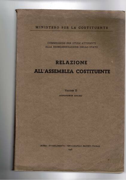 Relazione all'assemblea costituente. Vol. II° autonomie locali; problema della regione; Amministrazione locale.