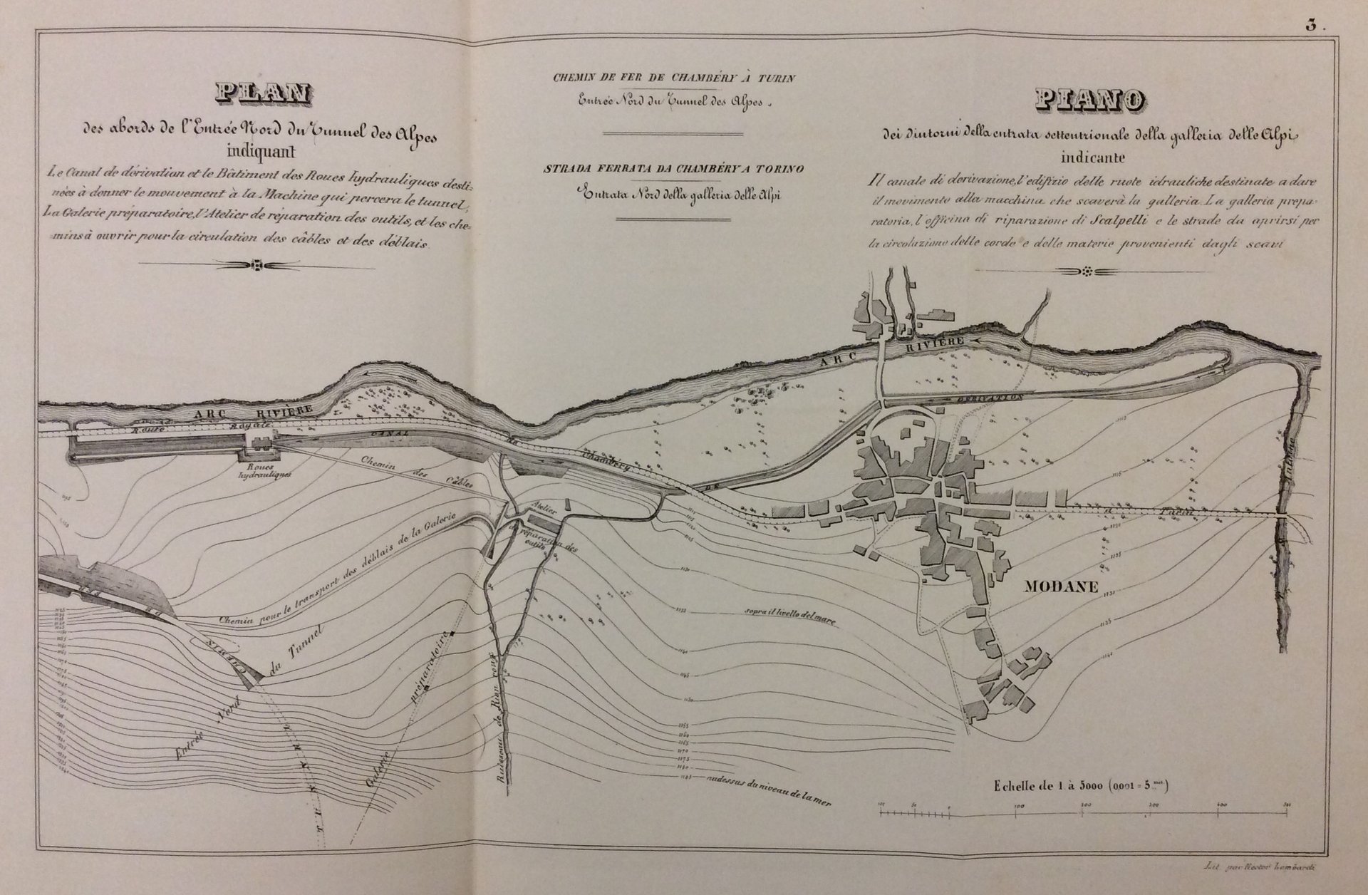 In-4 p. (mm. 310x204), mezza tela coeva, pp. 56, con 9 grandi tavole f.t., più volte ripiegate, alcune litografate e altre inc. in rame da Hector (Ettore) Lombardi con i titoli delle tavole in italiano e in francese. Esse rappresentano:<br>I. - Carta Generale delle Strade Ferrate eseguite e progettate al Nord e a Sud della Catena delle Alpi (mm. 600x930) /// II. - Piano della Strada Ferrata e della Strada Reale tra Modana e Susa (mm. 630x850) /// III. - Piano dei dintorni dell'entrata settentrionale della galleria delle Alpi indicante il canale di derivazione, l'edifizio delle ruote idrauliche destinate a dare il movimento alla macchina che scaverà la galleria.. (mm. 300x470) /// IV. - Piano dei dintorni dell'entrata meridionale della galleria delle Alpi indicante.. (mm. 310x610) /// V. - Edifizio delle ruote idrauliche. Entrata Nord della Galleria delle Alpi: elevazione longitudinale (mm. 310x480) /// VI. - Edifizio delle ruote idrauliche. Entrata Nord della Galleria delle Alpi: spaccato trasversale / spaccato longitudinale / facciata / piano delle fondazioni e canale scaricatore (mm. 310x480) /// VII. - Edifizio delle ruote idrauliche. Entrata Sud della Galleria delle Alpi: taglio longitudinale / Plan (mm. 310x480) /// VIII. - Officina di riparazione. Entrata Nord e Sud della Galleria delle Alpi: élévation / Plan (mm. 310x480) /// IX. - Macchina destinata per traforo della galleria preparatoria. Galleria delle Alpi: élévation / Plan (mm. 310x480)."Edizione originale" di questa relazione, pubblicata contemporaneamente in lingua francese e italiana dal Cavaliere Enrico Maus, Ispettore onorario nel Genio Civile, contenente gli studii da lui fatti della strada ferrata da Chambéry a Torino e sulla macchina da lui proposta per il perforamento dell'Alpi fra Modane e Bardonnèche e, da p. 35, il Rapporto dell'Ispettore Cavaliere Pietro Paleocapa fattone alla commissione incaricata dell'esame. Coi processi verbali della commissione medesima.Nel 1845 il cavaliere Luigi Des Ambrois di Nevache, ministro dellinterno e dei lavori pubblici, intraprese la costruzione delle ferrovie da Torino a Genova e da Alessandria al Lago Maggiore. Lingegnere belga Enrico Mauss (1808-1893), noto per i suoi studi sui piani inclinati di Liegi, che egli aveva chiamato a collaborare nella preparazione e nel primo sviluppo di questa linea, suggerì al ministro di far studiare seriamente la possibilità di una galleria sotto le Alpi Cozie. Il consiglio - scrisse lo stesso Des Ambrois - venuto da un uomo così illuminato e così pratico, fu preso in considerazione.. Il Mauss ebbe la missione di studiare il tracciato ed i mezzi meccanici per salire le pendenze e per forare le rupi nel modo più sollecito. Già l8 agosto 1845 egli consegnava il suo rapporto sulla ferrovia da Susa a Modana e sul traforo delle Alpi.. Il 15 agosto 1857 era promulgato il decreto autorizzante il Governo ad intraprendere i lavori secondo il progetto tecnico degli ingegneri Ranco, Grattoni, Sommeiller e Grandis.. Il 31 agosto 1857 re Vittorio Emanuele accompagnato da Cavour e da Paleocapa per il Moncenisio si recava a Modana, dove lo attendevano con le rappresentanze delle Camere e dellesercito gli ingegneri e i direttori dellimpresa, il principe Napoleone ed una folla di popolo festante (Barraja E., Il traforo del Frejus, 1921, pp. 21-22, 44-45).Esemplare ben conservato. .